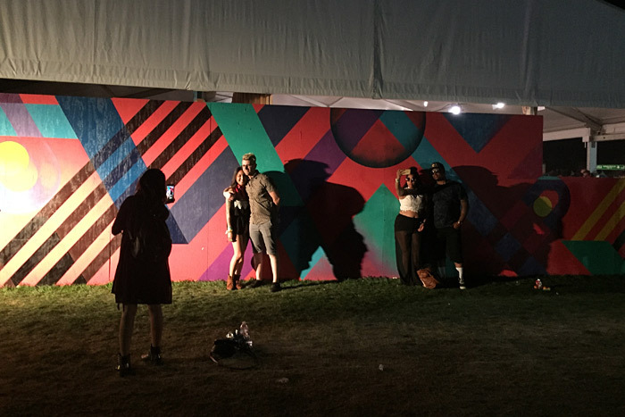 40X80英尺的帳篷中有一間有360度沙漠布景和綠屏背景的房間,客人可以與燈光、視頻內(nèi)容,風(fēng)力效果進(jìn)行互動(dòng),并錄制一段可供分享的視頻。在成年人帳篷區(qū)為21歲以上的客人提供啤酒,如同在一個(gè)私家花園里,上方懸掛著燈串,四周有籬笆環(huán)繞。像壁畫一樣的街頭藝術(shù)裝飾了巨大的帳篷商店的一側(cè),讓音樂節(jié)的觀眾駐足并拍照。