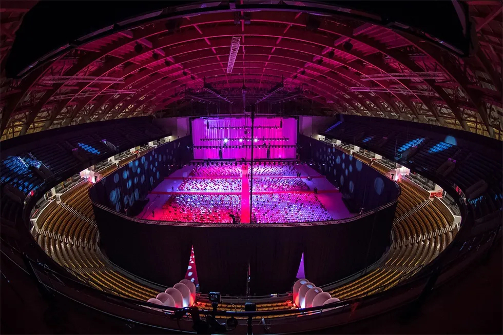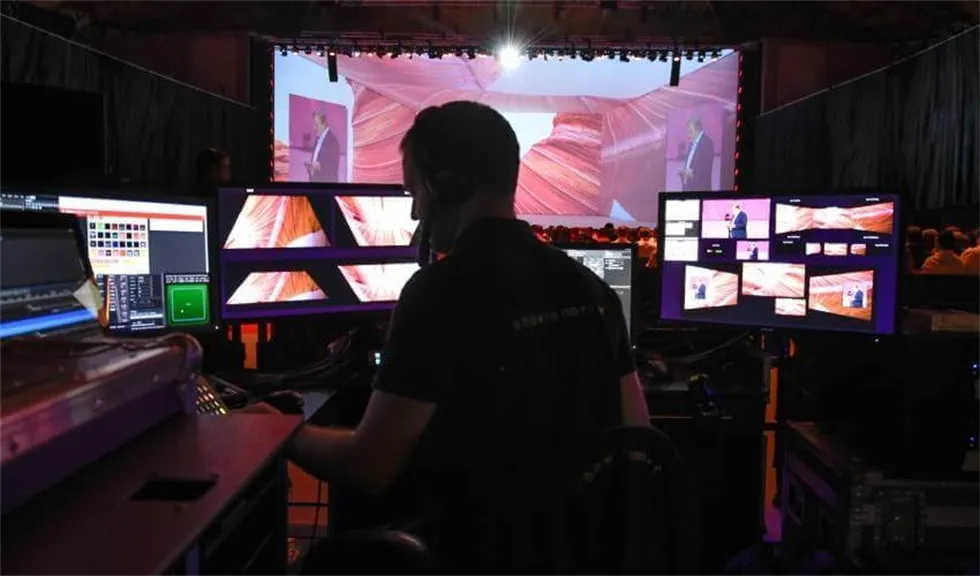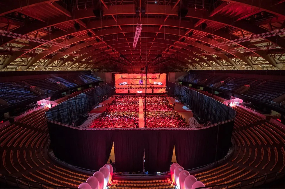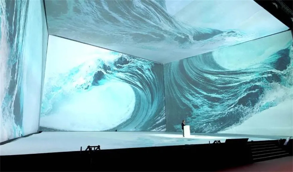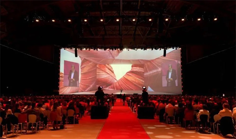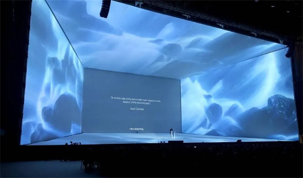今年的年會(huì)有來自16個(gè)國家/地區(qū)的4000多名嘉賓聚集到葡萄牙。整個(gè)活動(dòng)從策劃到制作經(jīng)過了幾個(gè)月,共有20家公司和超過1000人參與。活動(dòng)的執(zhí)行階段是在96小時(shí)內(nèi)完成的,即使是做了這么多工作,但客戶仍然需要些特別的東西。所有我們從“想得更遠(yuǎn)”的主題概念出發(fā),將傳統(tǒng)舞臺(tái)轉(zhuǎn)換到所謂的“盒子”的設(shè)計(jì)概念中,它很漂亮,我們創(chuàng)造一個(gè)三維體驗(yàn)將主題演講帶到了一個(gè)新的高度。這在工程、設(shè)計(jì)、生產(chǎn)、數(shù)據(jù)管理上需要更高的水平。整個(gè)舞臺(tái)是一個(gè)尺寸為42×22米的三維投影盒,分辨率為12287×9578,約1.18億像素,42萬流明。所有投影內(nèi)容都是從零開始創(chuàng)建。總而言之,有7個(gè)機(jī)構(gòu)負(fù)責(zé)為演講者創(chuàng)作和制作內(nèi)容,確保他們最大限度地發(fā)掘“盒子”的潛力。因?yàn)橥渡涞膬?nèi)容是量身定制的,并且為了確保所有內(nèi)容都是完美的,所以在活動(dòng)之前制作了一個(gè)“盒子舞臺(tái)”的小復(fù)制品,以測試所有內(nèi)容并微調(diào)編輯細(xì)節(jié)。