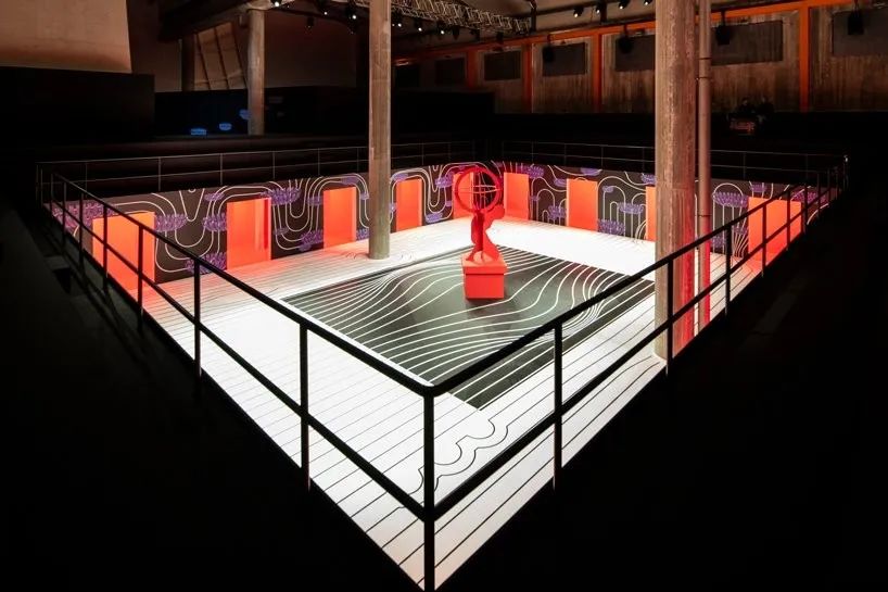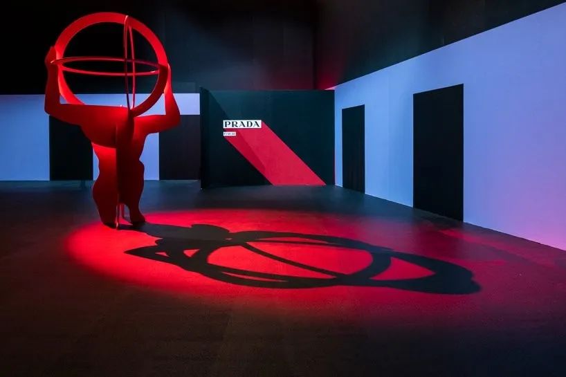 每個(gè)構(gòu)圖的中心都有一幅地圖集雕像,抽象成一系列滑動(dòng)和連鎖的平面。在每個(gè)空間邊緣的黑色墻壁之外,都散發(fā)出神秘的紅色醚,標(biāo)志著場(chǎng)景的極限與無(wú)限。發(fā)光的紅色門(mén)道也為prada的模特提供了出入口,這些模特沿著不可見(jiàn)的軌跡模糊了裸露和隱藏之間的邊界,在快速的出現(xiàn)和消失之間徘徊。