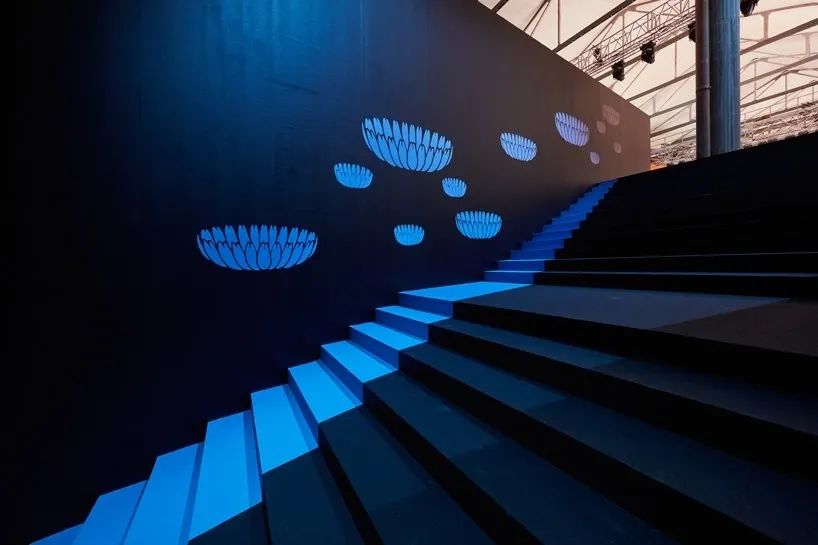 在2020年米蘭秋冬普拉達(dá)(prada)女裝秀上,OMA的研究與設(shè)計(jì)工作室AMO已將deposito大會(huì)堂(多功能表演場(chǎng)所,是prondazione prada建筑群的一部分)改建成了一系列虛構(gòu)的廣場(chǎng)。登上大樓梯后,客人進(jìn)入展覽空間,在一個(gè)高臺(tái)上可以俯瞰兩個(gè)相同的空間,每個(gè)空間都包含一個(gè)虛構(gòu)的庭院。