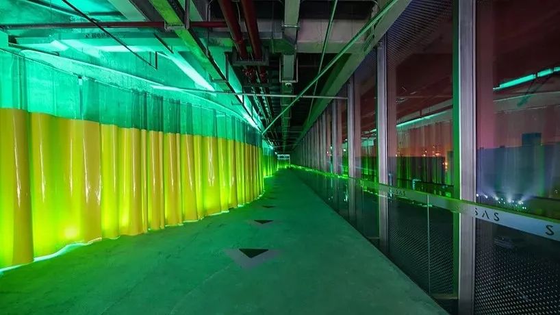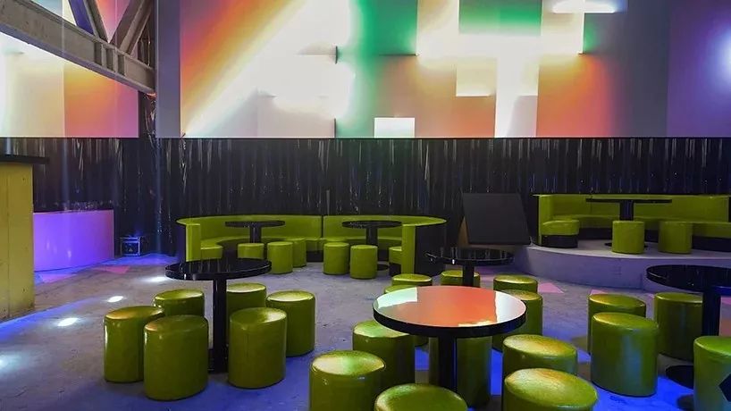 演出結(jié)束后,客人將被邀請(qǐng)到筒倉的七樓,只在一晚的時(shí)間內(nèi)入住。該區(qū)域圍繞著不同的表演組織,這些表演在多個(gè)舞臺(tái)上進(jìn)行,非正式地貫穿整個(gè)活動(dòng)空間。酒吧四周環(huán)繞著連續(xù)的黑色和酸性綠色生態(tài)皮革的攤位,在俱樂部開幕前舉辦晚宴和一系列的音樂和戲劇表演。同時(shí),一個(gè)戲劇性的100%可回收的黑色漆幕墻環(huán)繞著場地,一系列霓虹燈勾勒出房間的形狀,反映了下面展示空間的主題。