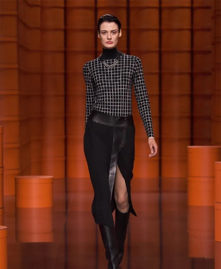 愛馬仕經(jīng)典的橙色盒子遍布秀場,高高低低禮物盒堆仿佛悅動的音樂旋律,模特們身著著最新一季的時裝穿梭在愛馬仕橙的世界中,凌厲有型。