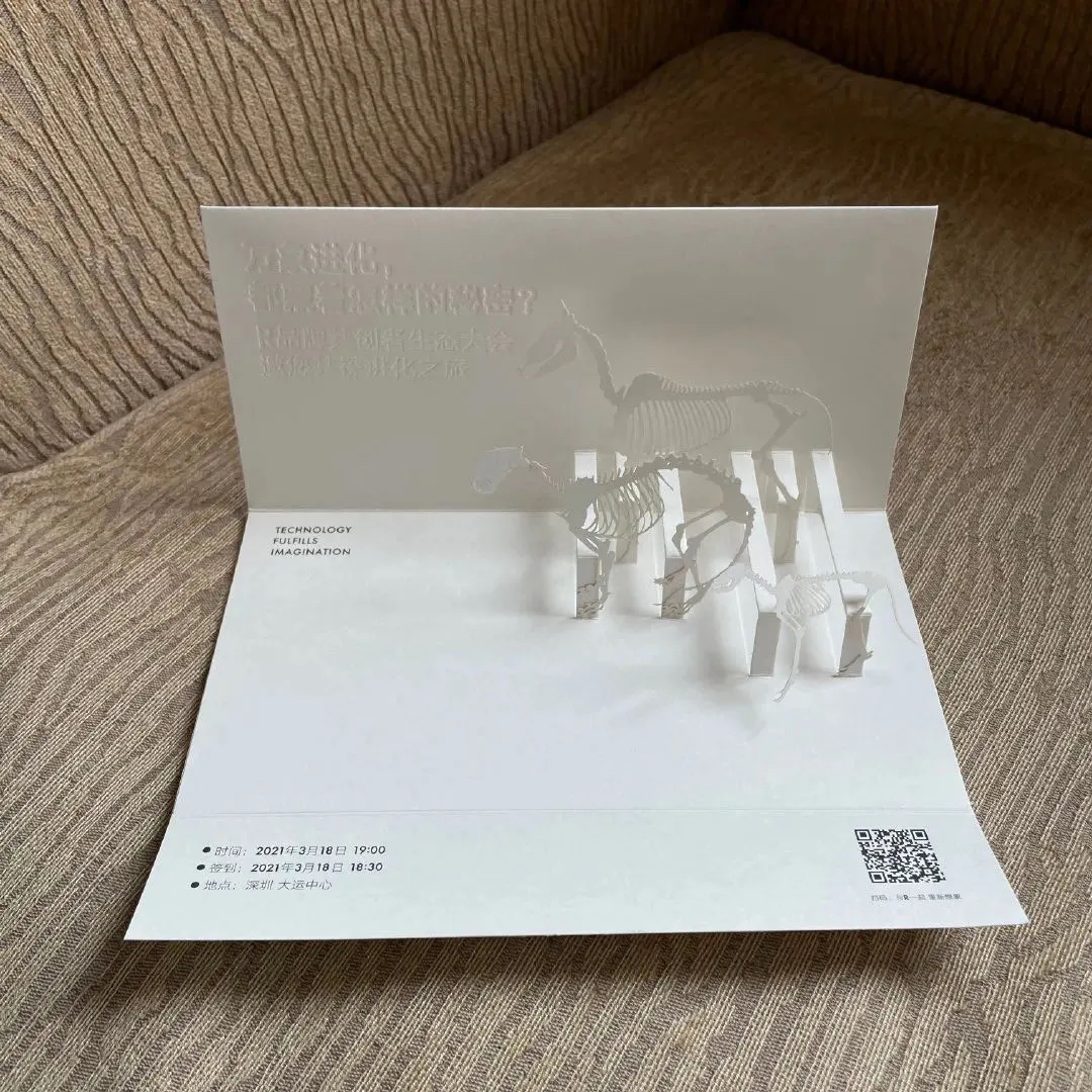 本次R品牌邀請(qǐng)函極具特點(diǎn),在視覺(jué)與觸感上做到了極致。當(dāng)你收到邀請(qǐng)函時(shí),你會(huì)看到一個(gè)來(lái)自R品牌所便拋出的問(wèn)題:“萬(wàn)物進(jìn)化,都藏著怎樣的秘密?”當(dāng)你翻開(kāi)邀請(qǐng)函后,兩副來(lái)自遙遠(yuǎn)時(shí)空的立體恐龍骨架便躍然眼前,“從骨骼探尋歷史的脈絡(luò),以遺跡推測(cè)未來(lái)的奧秘,讓科技真正實(shí)現(xiàn)人類所憧憬的美好生活”,這便是R品牌所給出的答案。