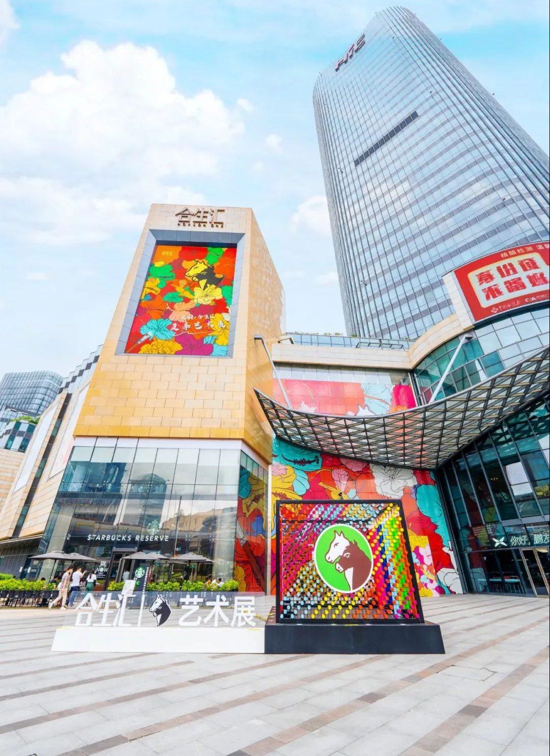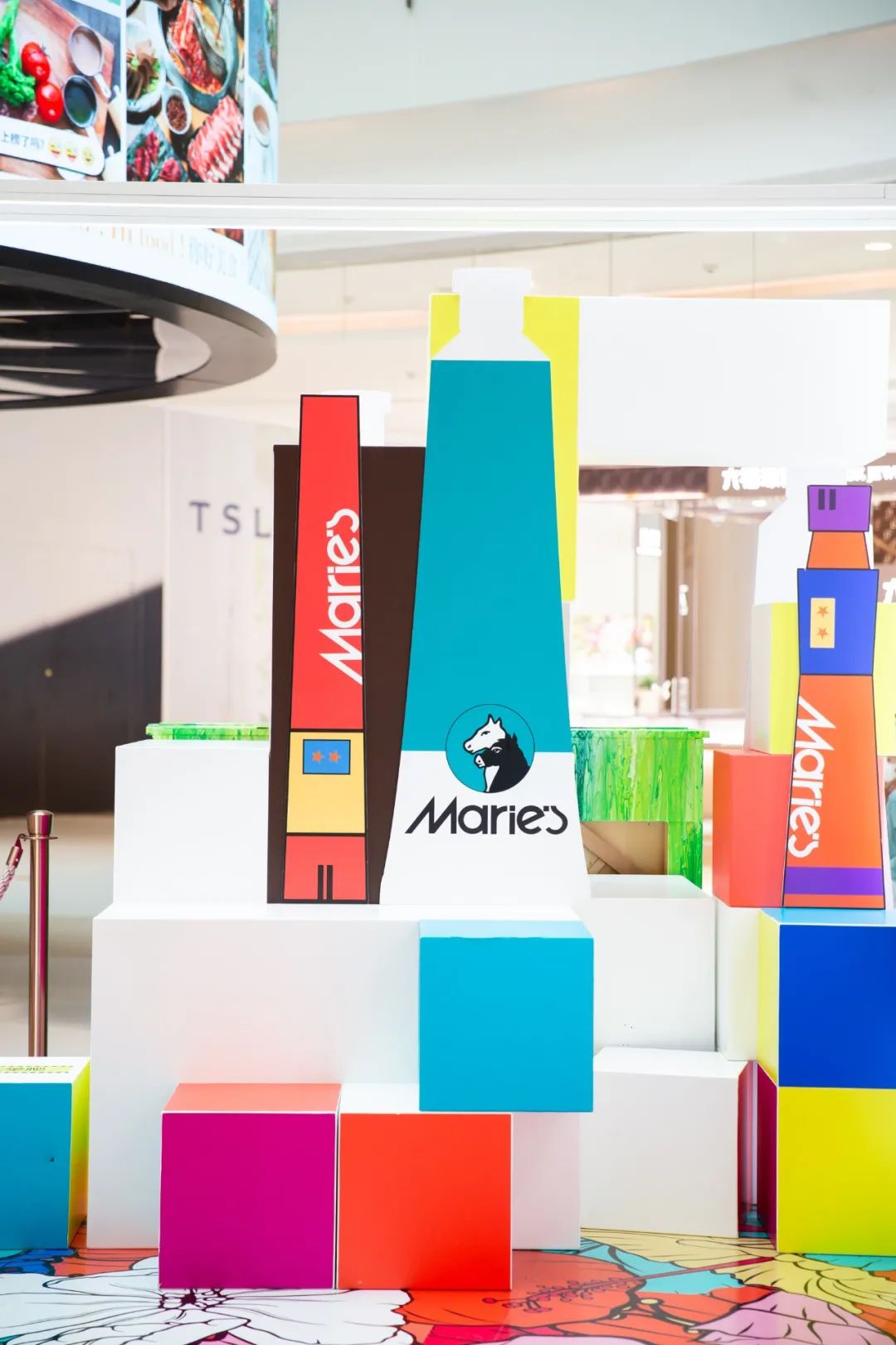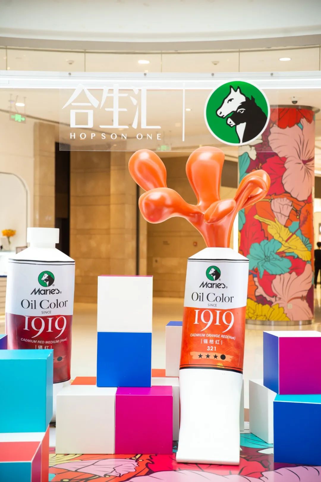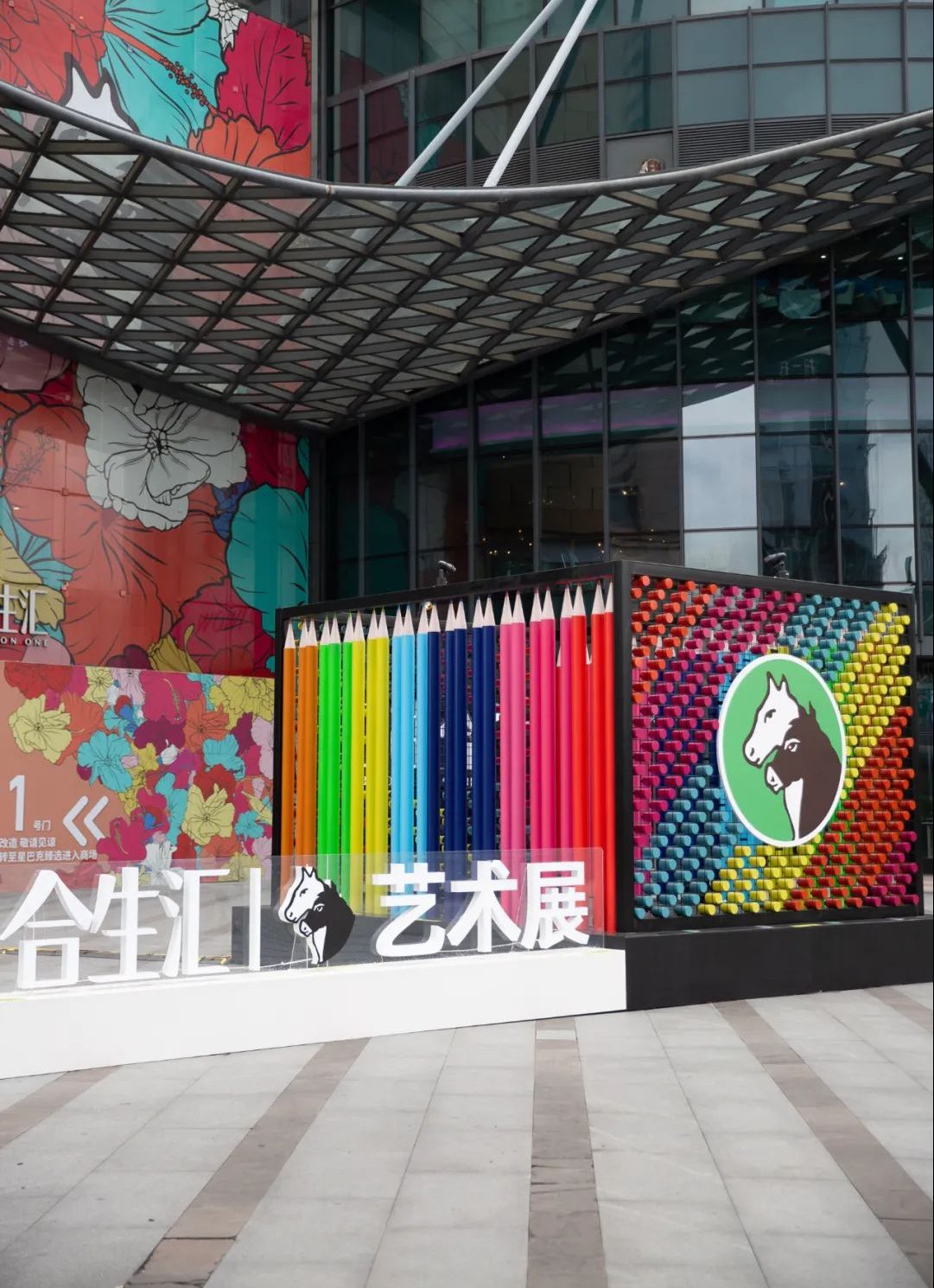 這次夏季藝術(shù)展的開幕之作共布置了4座以Marie’s馬利顏料為靈感的藝術(shù)裝置,還未走近商場(chǎng),視線就被牢牢鎖??!除了Marie’s馬利家標(biāo)志性的黑白雙色馬頭logo,整座藝術(shù)裝置都是由顏料棒和彩色鉛筆組成,夏日橙、天空藍(lán)、亮黃色…組成“彩虹墻”,非常好出片。商場(chǎng)已經(jīng)變身成為“藝術(shù)花園”,大幅的花朵彩繪在商場(chǎng)隨處可見,走進(jìn)其中,一場(chǎng)繽紛的藝術(shù)之旅就開始了。