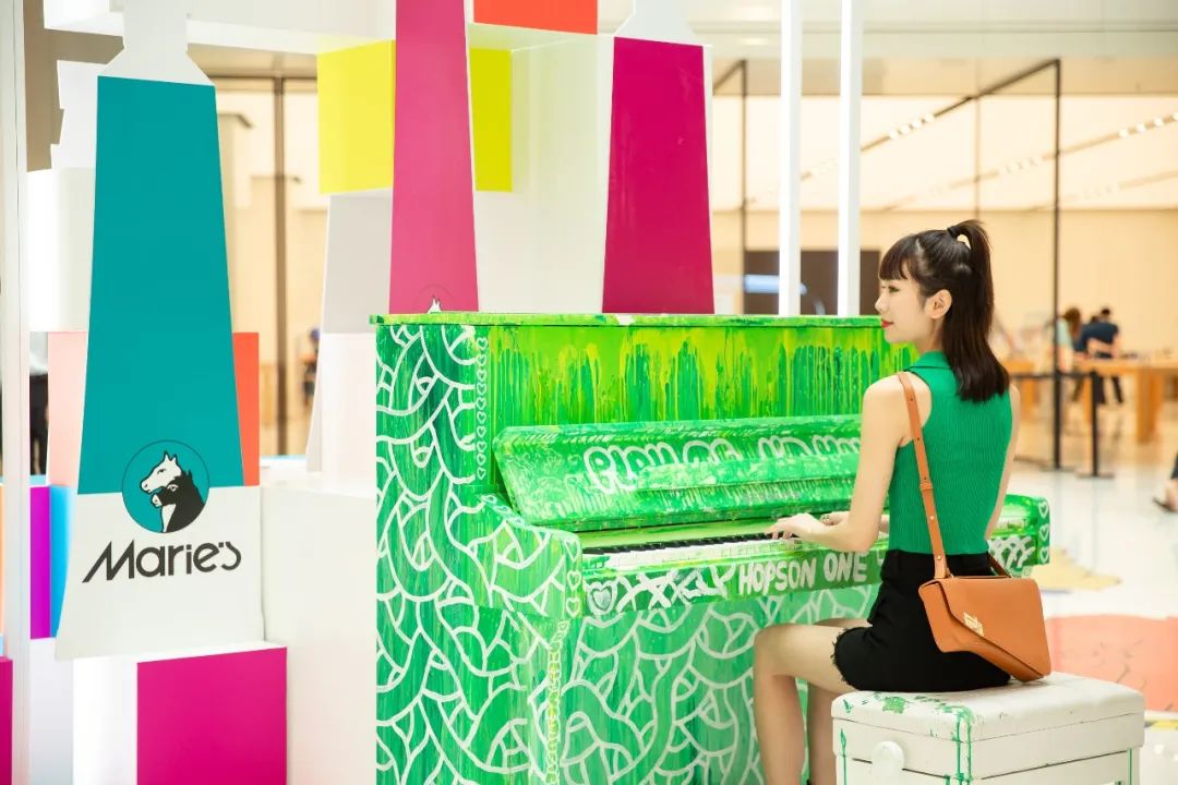 第二站來到一個(gè)色彩繽紛的「魔方空間」,整座裝置由數(shù)十個(gè)彩色“魔方”組成,超大號(hào)的Marie’s馬利水彩顏料散落其間,非常有趣??吹竭@些高低錯(cuò)落的彩色方塊,滿屏的彩色瞬間掃除情緒陰霾,拉上同伴隨意拍一拍,氛圍感十足!在裝置的背后還藏著一個(gè)“小彩蛋”,稍微花點(diǎn)心思才能找到TA。藝術(shù)家們將鋼琴當(dāng)做“畫板”,周身繪出綠葉脈絡(luò)的紋理,這才是夏天的感覺嘛,逛展逛累了或者一時(shí)興起,還可以坐下來彈奏一曲~