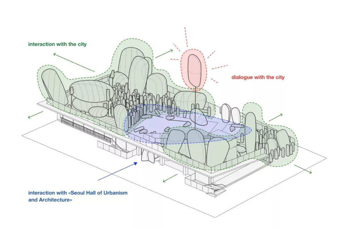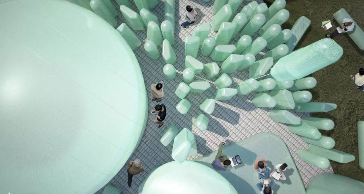 整個裝置使用ETFE材料,充氣,輕便可移動,并被設(shè)想為傳統(tǒng)韓國花園的現(xiàn)代詮釋。其賦予韓國花園獨特的個性,探索并重新定義它,顏色和形狀也讓人想起植物,石頭和山丘,構(gòu)成了韓國園林和諧理論的基礎(chǔ)。