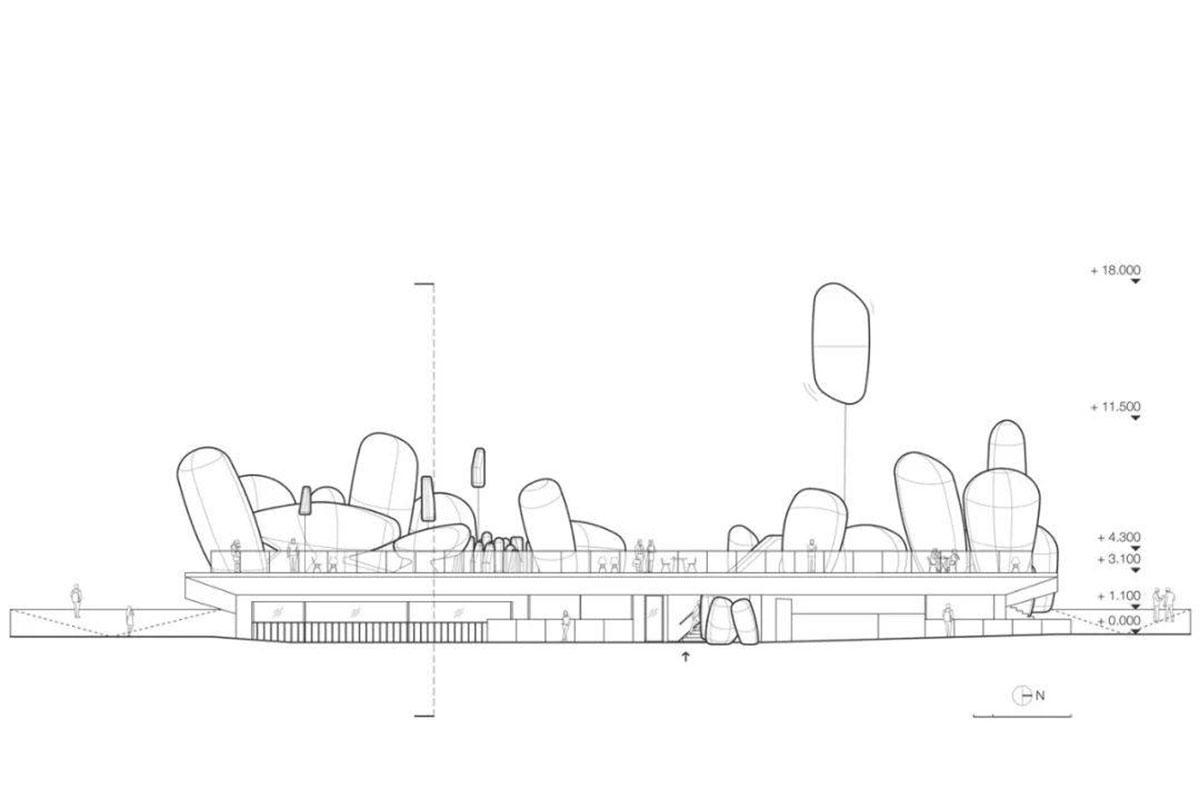 由于物體的可移動性,可以執(zhí)行許多獨特的場景迭代,它成為隨時間變化的活生物體。整個設(shè)計還包含一系列較小的“飛行元素”,充滿氦氣并附著在場地上的充氣玩具,讓整個首爾都可以看到充氣景觀,也可以作為展覽和活動的廣告牌。當(dāng)所有充氣寶石都覆蓋著夜光涂料圖案時,在夜晚它會成為另一種呈現(xiàn)方式,創(chuàng)造一個新的平行現(xiàn)實,闡述了New Korean Garden的故事。