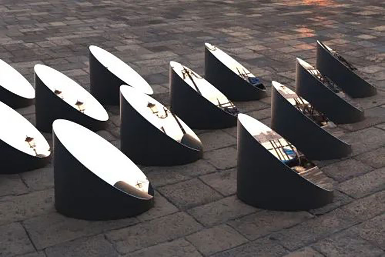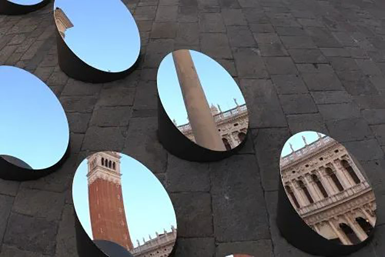 近期,法國(guó)藝術(shù)家Arnaud Lapierre在意大利威尼斯總督宮博物館前的廣場(chǎng)上發(fā)布了一組沉浸式動(dòng)態(tài)藝術(shù)裝置?——?AZIMUT,16面裝有馬達(dá)底座的圓形棱鏡,同步圍繞座軸轉(zhuǎn)動(dòng)。藝術(shù)裝置位于斯拉夫人堤岸水濱,還能夠映射到圣喬治·馬累焦島上的教堂。裝置鏡面把周圍歷史悠久的建筑解構(gòu)成不同元素,又在人們的不同視角中重組,同時(shí)在每一面棱鏡中,又提供了平時(shí)不易被觀察到的建筑細(xì)節(jié)。Arnaud Lapierre的鏡面裝置早已全球聞名,他的作品總能利用鏡子,從不同角度反射出周圍的一切,讓每一位路過的游客用嶄新的角度體驗(yàn)公共空間。