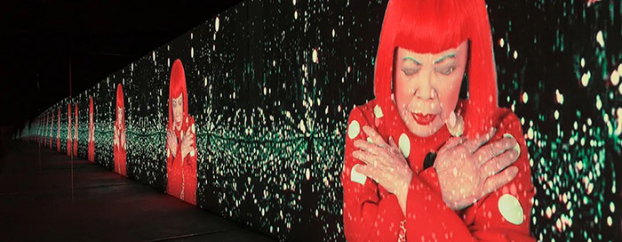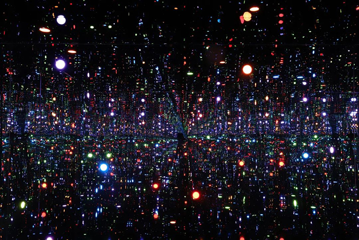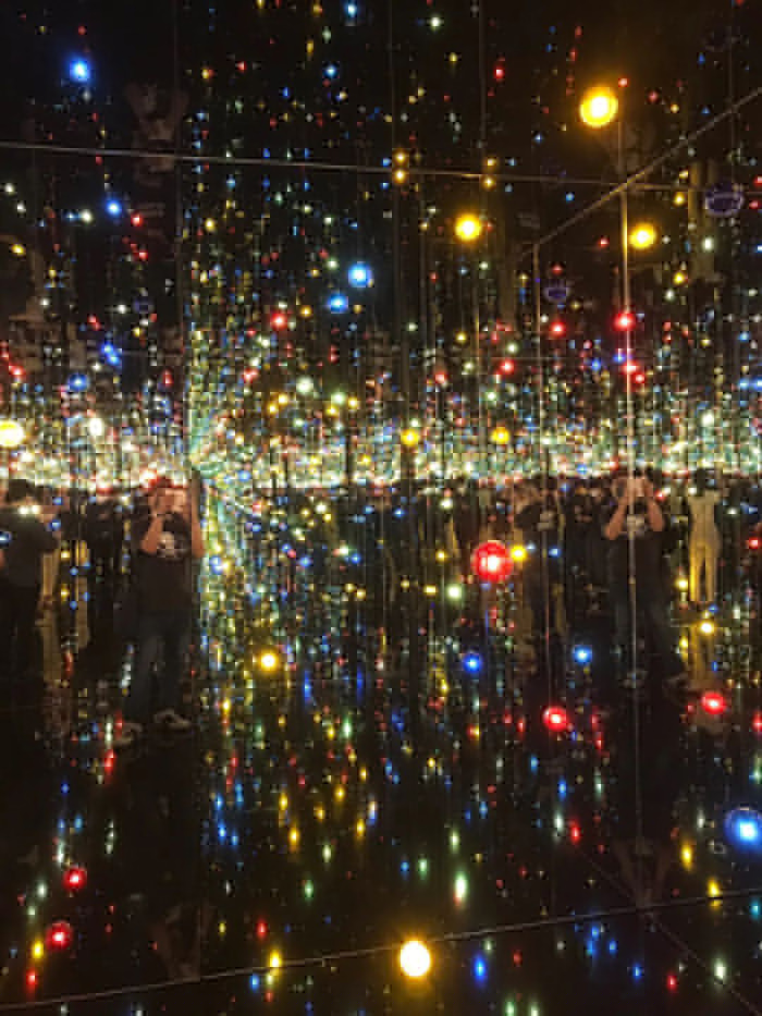 另外一個(gè)草間彌生創(chuàng)建的裝置藝術(shù)作品《無(wú)限之鏡之間-從宇宙的彼方召喚來(lái)的人類的幸福的愿望》,繪畫的則是草間彌生對(duì)宇宙和未知世界的渴望,跑進(jìn)鏡室,仿佛置身于無(wú)限宇宙的星塵之中,轉(zhuǎn)讓人忘記了恐懼,只剩下眼睛不給的幻影。