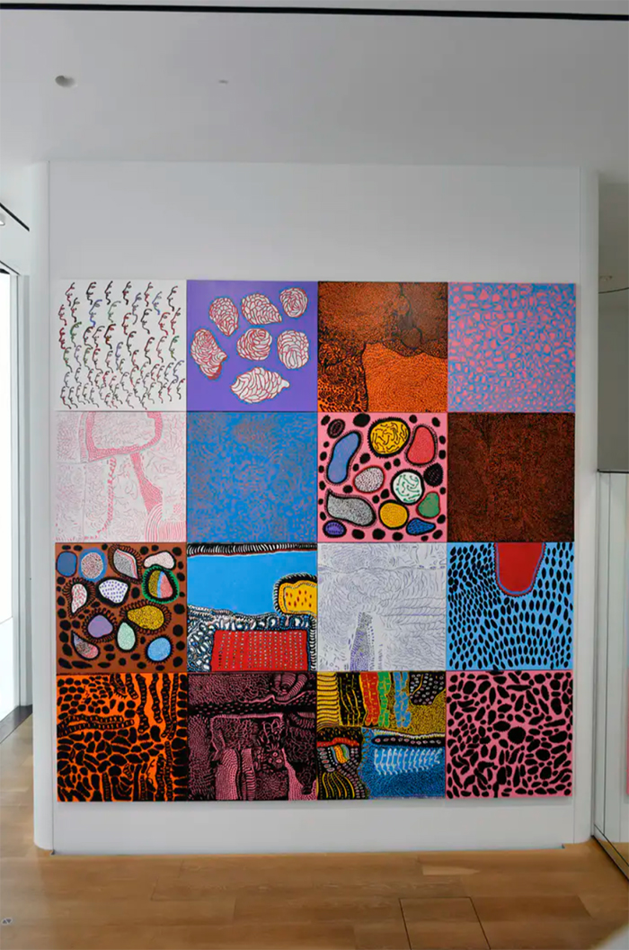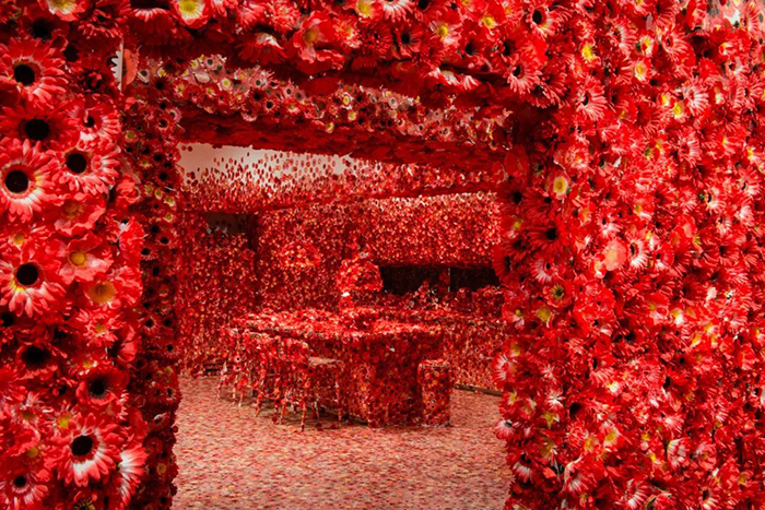 其中,在從2009年起便開始的《わが永遠(yuǎn)の魂》系列畫作中,草間彌生將他內(nèi)心世界的幻象,一一傾瀉而出,化成一幅幅一平方公尺大小的大型畫作,整齊陳列著,與大家分享他過(guò)往心理活動(dòng)的起伏、變化。而在他最新的裝置藝術(shù)作品《フラワー?オブセッション(FLOWEROBSESSION)》中,他將覆蓋了整個(gè)房間的圓點(diǎn),換成鮮艷色彩的花朵,從地板到天花板全都是他對(duì)花朵的迷戀與癡迷,讓人分不清楚,現(xiàn)在究竟是身處于花海之中,還是另一個(gè)幻象世界。