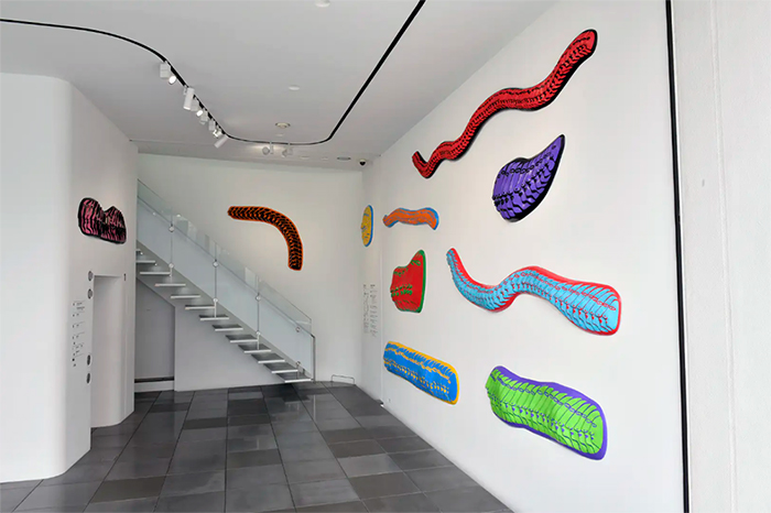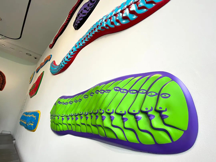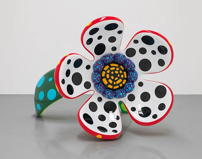 展品包括位于1樓入口處的《永遠(yuǎn)に続く女の魂》,通過(guò)鋁鑄制制成女性輪廓,仿佛漂浮在空中的輕盈感,用色鮮明強(qiáng)烈。美術(shù)館4樓也有立體的《天空にささげたわたしの心のすべてをかたる花たち》銅鑄造作品。兩件作品都是草間彌生于2020年創(chuàng)作的,看來(lái)她近年喜歡利用鋁及青銅的材質(zhì)創(chuàng)作。
