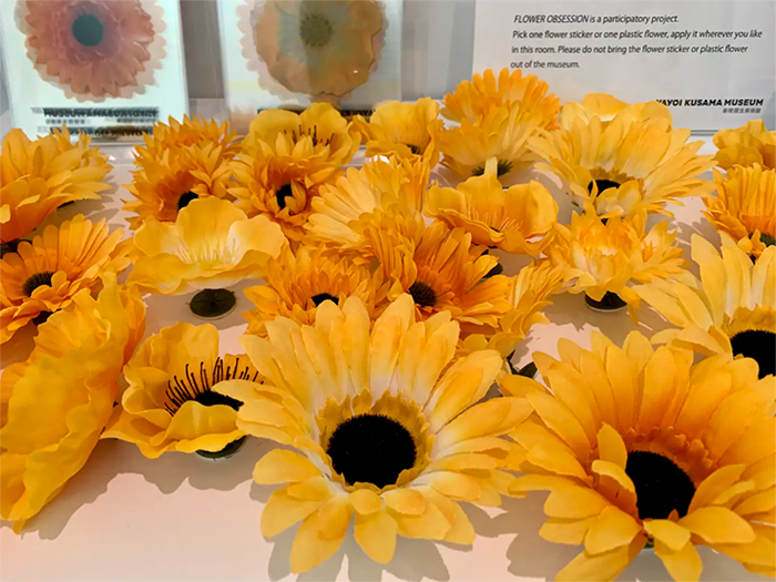 在4樓,能體驗(yàn)到首次公開的參與型作品《插花大會(huì)》(2017年/22020年)。本作是草間彌生曾經(jīng)在自傳中說(shuō)過(guò)的,桌布的花紋在房間里增殖的幻覺視覺作品化的作品。觀賞者可以將花的標(biāo)簽或鮮花帶入房間,貼在自己喜歡的地方。隨著時(shí)間的流逝,花也增加了,漸漸接近了草間的視覺。