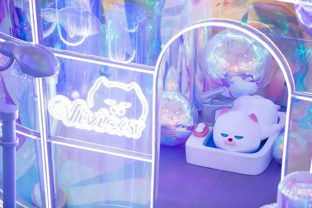 此次,ViViCat華東首展將獨特的形態(tài)、色彩、工藝、格調(diào)等有機融合,從而形成完整的故事主題。美陳展長達10米,高達5米,巨大的ViViCat躺在充滿泡泡的浴缸里,到處都是晶瑩的泡泡,仿佛步入一場奇幻的夢境。浴缸的內(nèi)部是沉浸式空間,燈光會隨走動而相應(yīng)發(fā)生變化,如同身處極光之中。觸摸泡沫,光的顏色也會隨之變化,仿佛與慵懶的ViViCat一同沐浴。