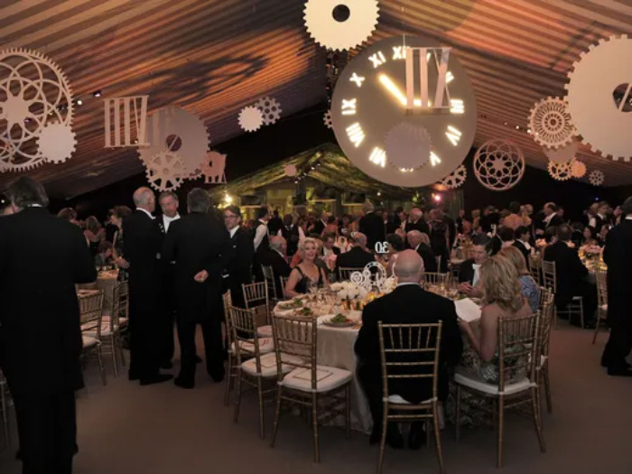 天鵝草坪上的帳篷里,現(xiàn)場(chǎng)被搭建成一個(gè)壯觀的活動(dòng)現(xiàn)場(chǎng)。雞尾酒接待區(qū)被設(shè)計(jì)成一片綠色的景象,綠植紋的織物覆蓋著帳篷的墻壁,超大的鼓形吊墜裝飾物掛在頭上,上面是蕨類植物圖案裝飾。宴會(huì)區(qū)是奶油色和柔和的粉紅色,點(diǎn)綴著巧克力色和亮粉色呈現(xiàn)出夢(mèng)幻般的優(yōu)雅,設(shè)計(jì)師用天花板上精心設(shè)計(jì)安裝的時(shí)鐘裝飾,展現(xiàn)了時(shí)間所意涵的永恒概念,完美地表達(dá)了“永恒優(yōu)雅”的活動(dòng)主題,并為這個(gè)迷人的活動(dòng)提供了一個(gè)美麗而富有戲劇性的中心裝飾品。