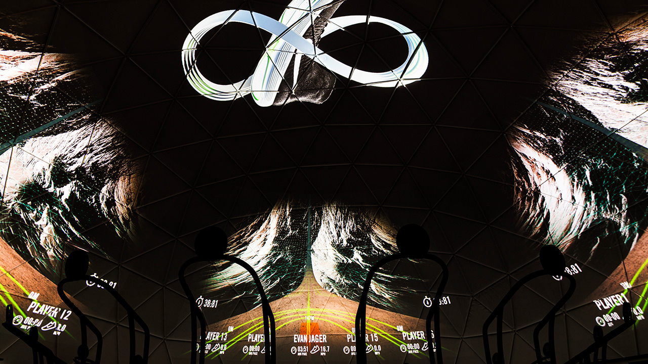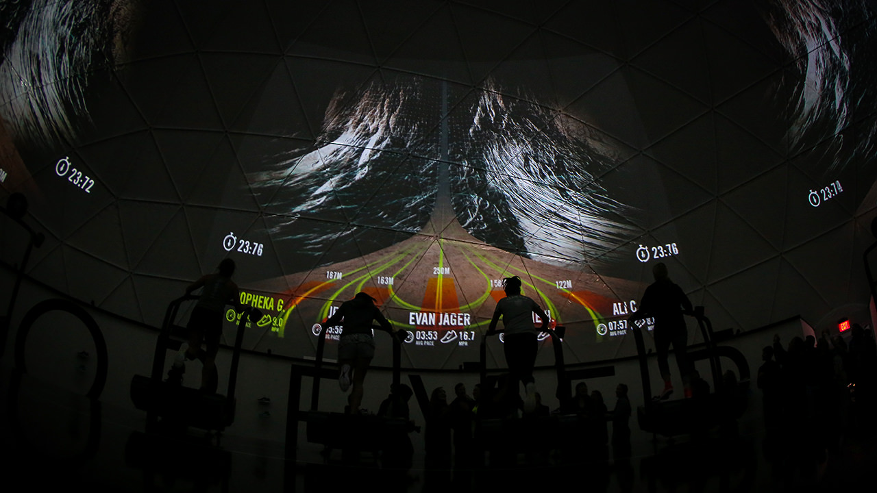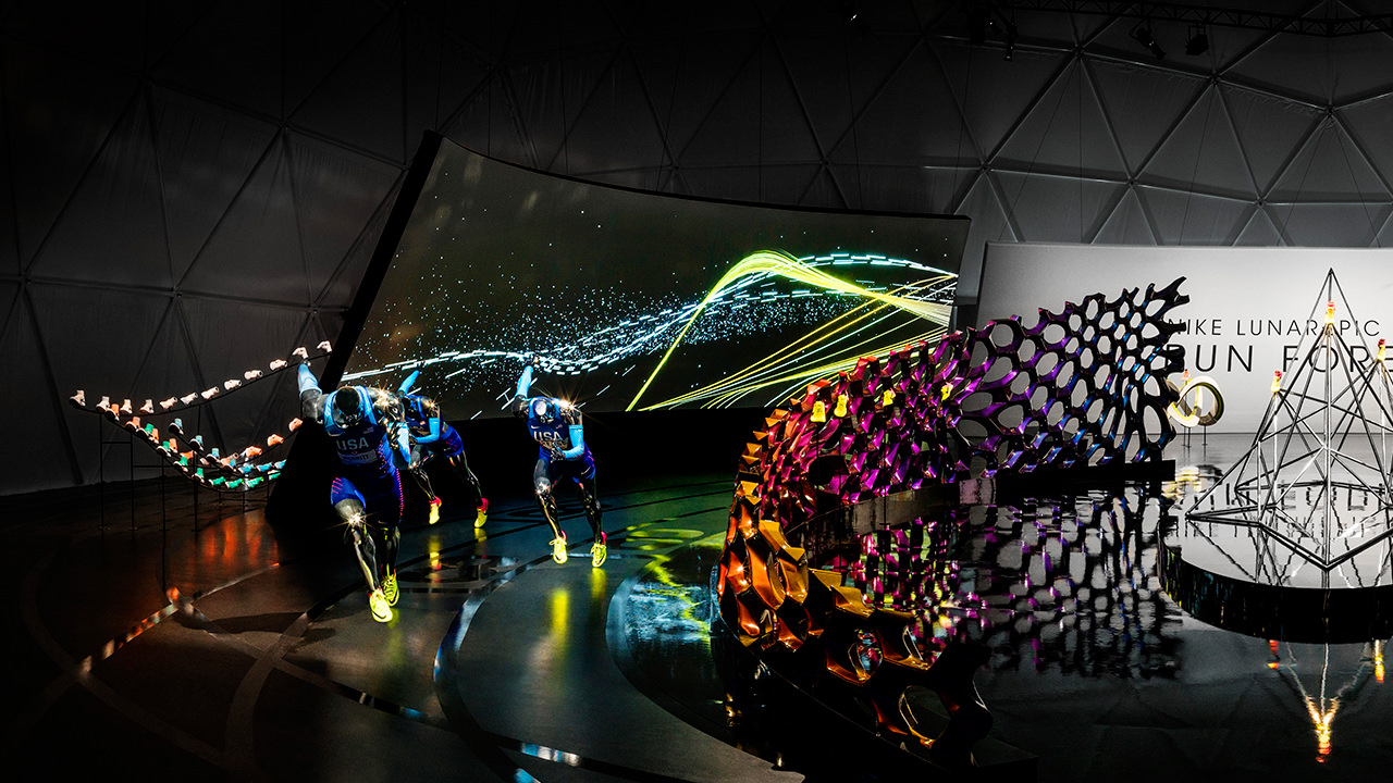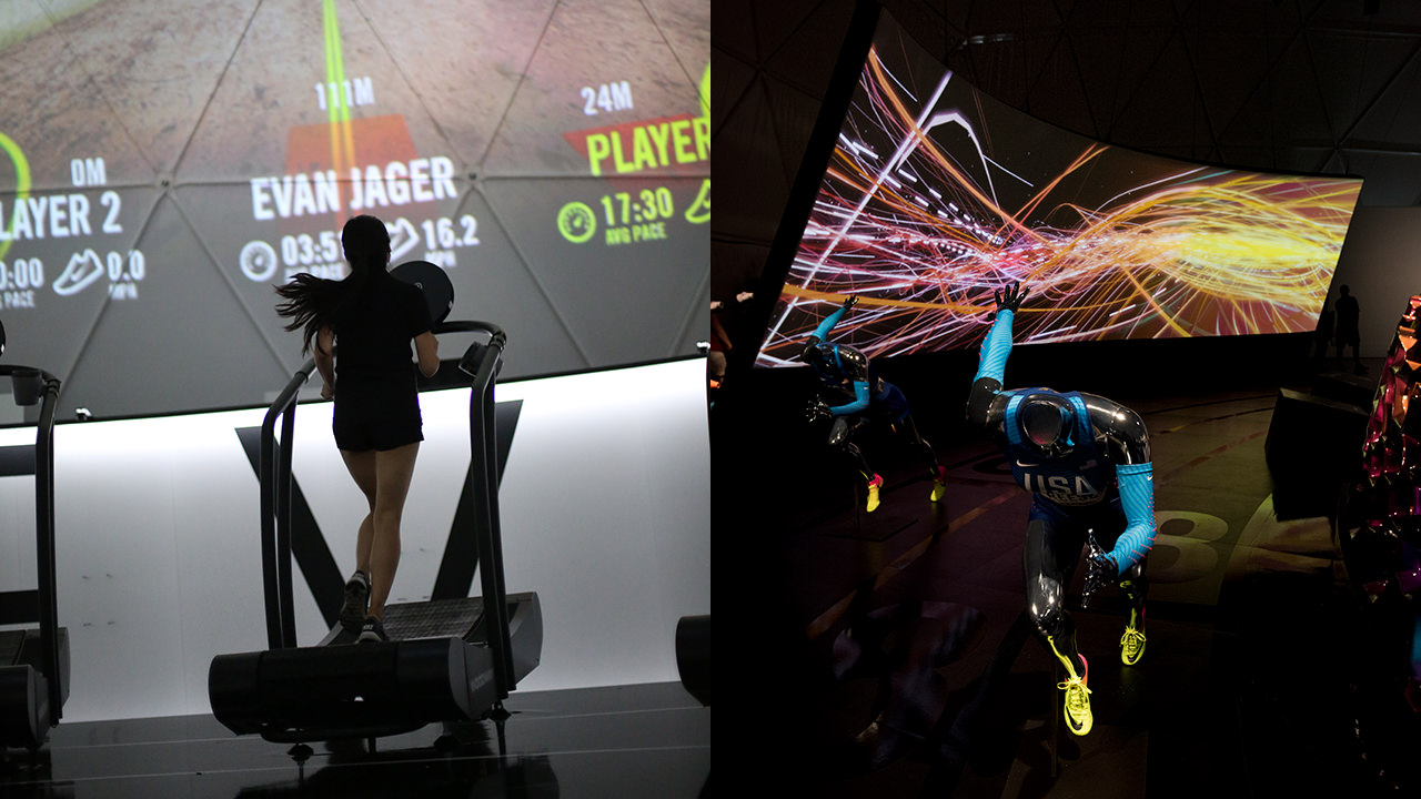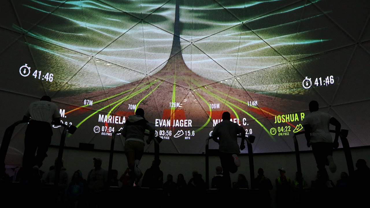 使用Nike Run Club和Lunar鞋類品牌作為展覽基地,16名跑步者一次在試驗(yàn)圓頂?shù)?60o虛擬環(huán)境中參加跑步機(jī)比賽。
