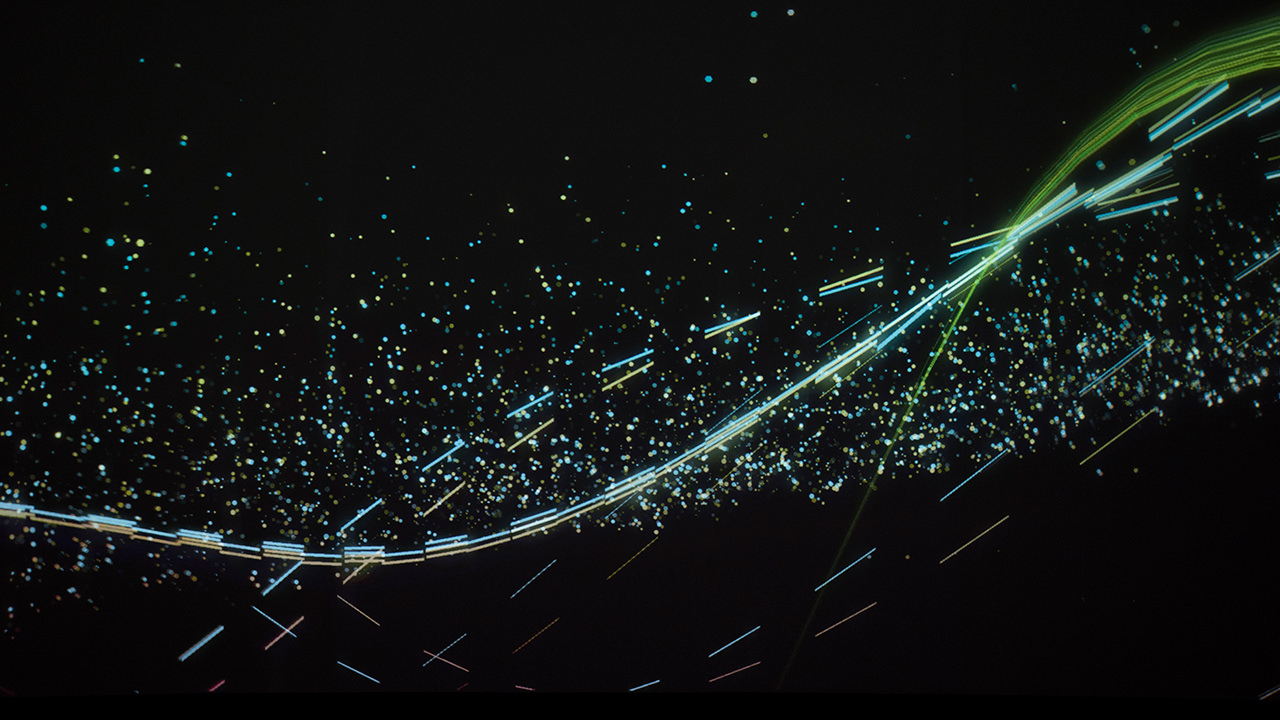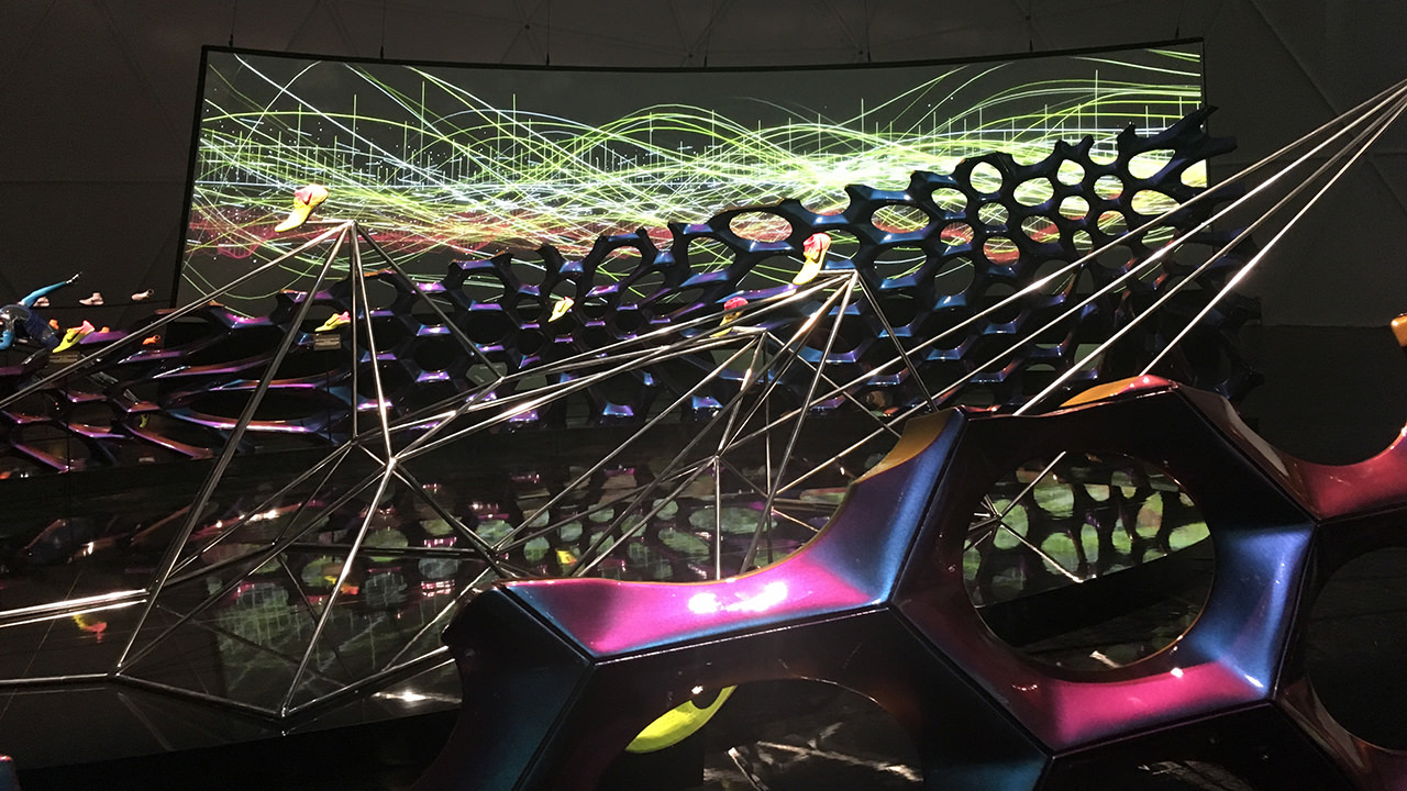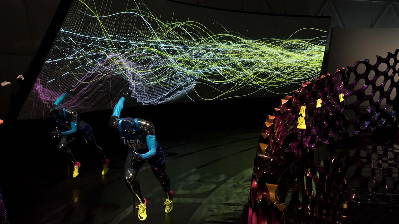 在創(chuàng)新圓頂中,創(chuàng)造了一個(gè)令人驚嘆的大規(guī)模,代碼生成的雕塑投影。對(duì)稱視覺效果和動(dòng)態(tài)配樂描繪了耐克跑鞋與田徑相關(guān)的速度,數(shù)據(jù)和美感。一切都是實(shí)時(shí)生成的,這意味著每次觀看都會(huì)有不斷變化的音頻/視覺效果。