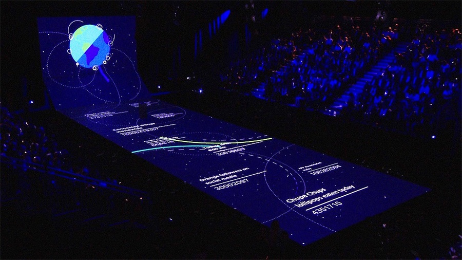 在馬德里橙色領(lǐng)導(dǎo)者會(huì)議上,活動(dòng)大膽地將舞臺(tái)背景與地面進(jìn)行了視頻投影,運(yùn)用投影映射技術(shù)讓舞臺(tái)呈現(xiàn)了與以往完全不同的沉浸式的視覺(jué)體驗(yàn),而且活動(dòng)中使用的動(dòng)畫都非立體的動(dòng)畫視頻素材,這在視頻素材制作中也減少了大量的成本。