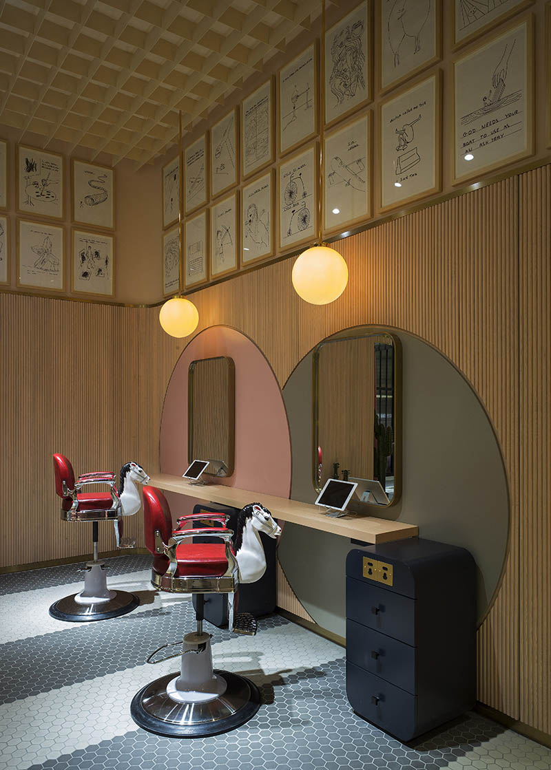 MAY& J摒棄了傳統(tǒng)理念中的歐美風(fēng)和酷炫風(fēng),通過直觀化的空間享受,巧妙地運(yùn)用了少女系的粉紅和天藍(lán)色,加以奢華的金黃色搭配,再加以燈光、鉛筆漫畫、蜂巢型的地板和更具造型意義的仙人掌進(jìn)行裝飾點(diǎn)綴,為顧客營造出一個(gè)更舒適、更清新而又自由的新型沒發(fā)體驗(yàn)店,從視覺上、空間上,都給顧客一種全新的體驗(yàn),更是妥妥的網(wǎng)紅打卡點(diǎn)嘛!