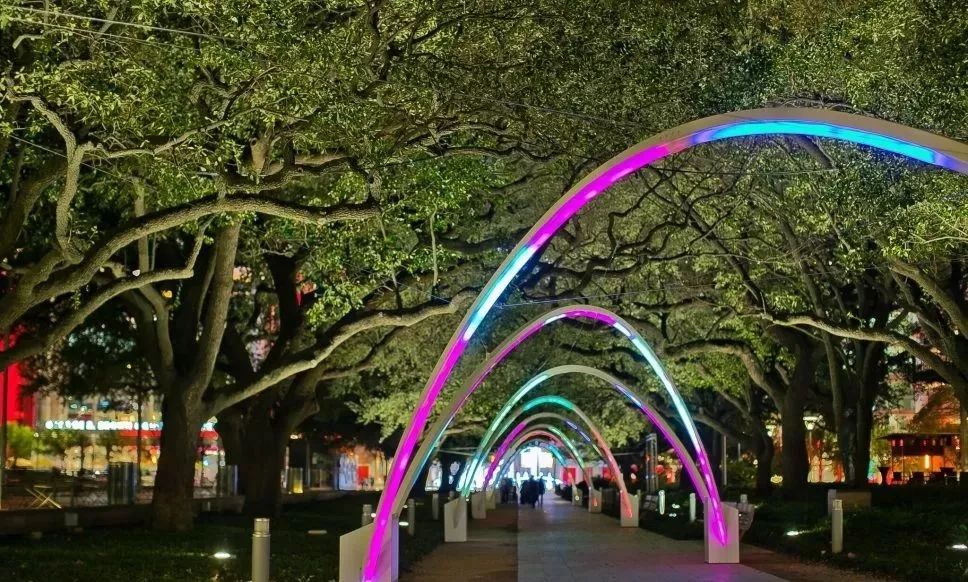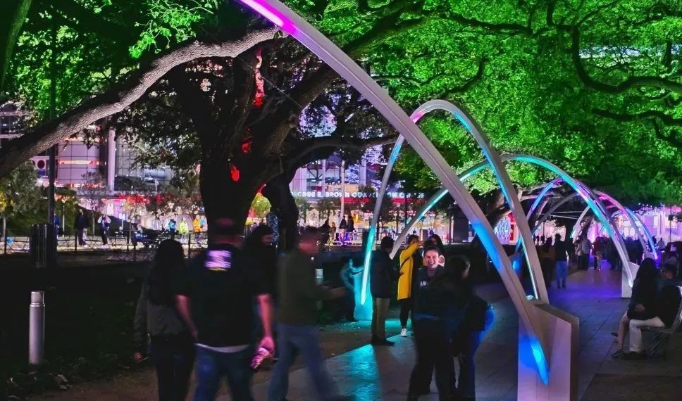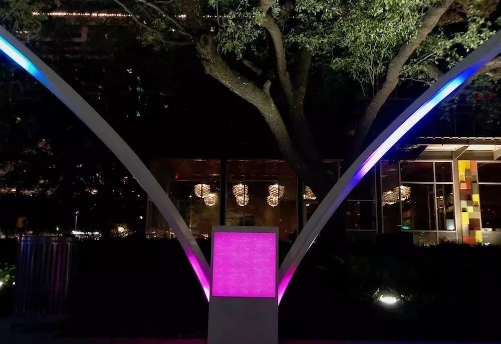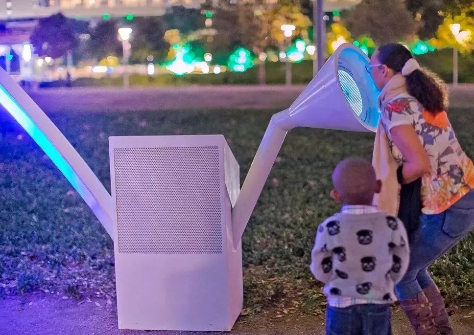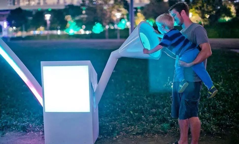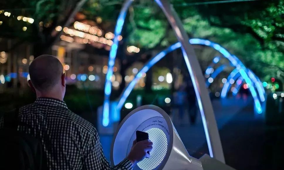 可以讓你與大自然交流的一種互動(dòng)裝置你見(jiàn)過(guò)嗎?來(lái)這里體驗(yàn)這個(gè)互動(dòng)裝置吧。這個(gè)聲音互動(dòng)裝置采用弧形照明拱廊的方式從地面延伸到樹(shù)冠的接縫處,體驗(yàn)者從拱廊兩端輸入語(yǔ)音信息便可以觀看或聆聽(tīng)來(lái)自“樹(shù)先生”的回答。