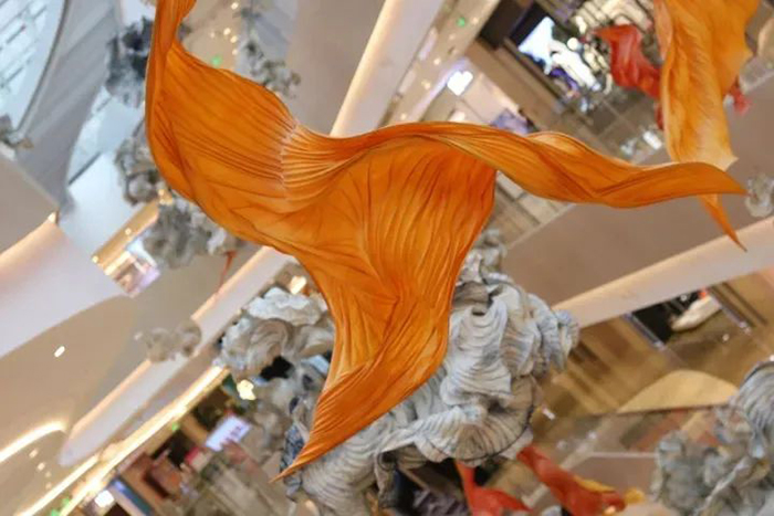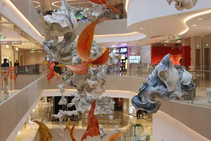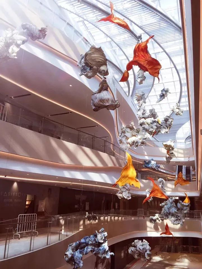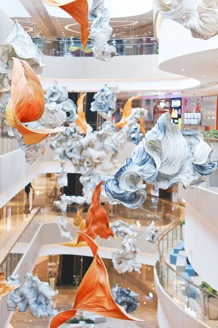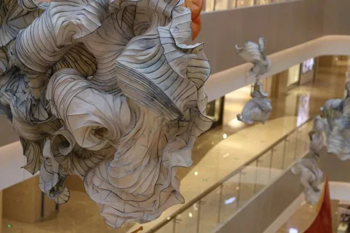 精致并且有質(zhì)感,是Peter Gentenaar的特色,顏色的變化和紙材的卷曲讓人看不出來到底是用什么材質(zhì)制作而成,他的作品懸掛在蘇州中心星悅匯中庭,作品有的像是大自然中的一片葉子,悠閑的飄在了半空中;有的像是水中的生物優(yōu)雅的漂浮在水中,似乎是在對商業(yè)空間的禮贊。