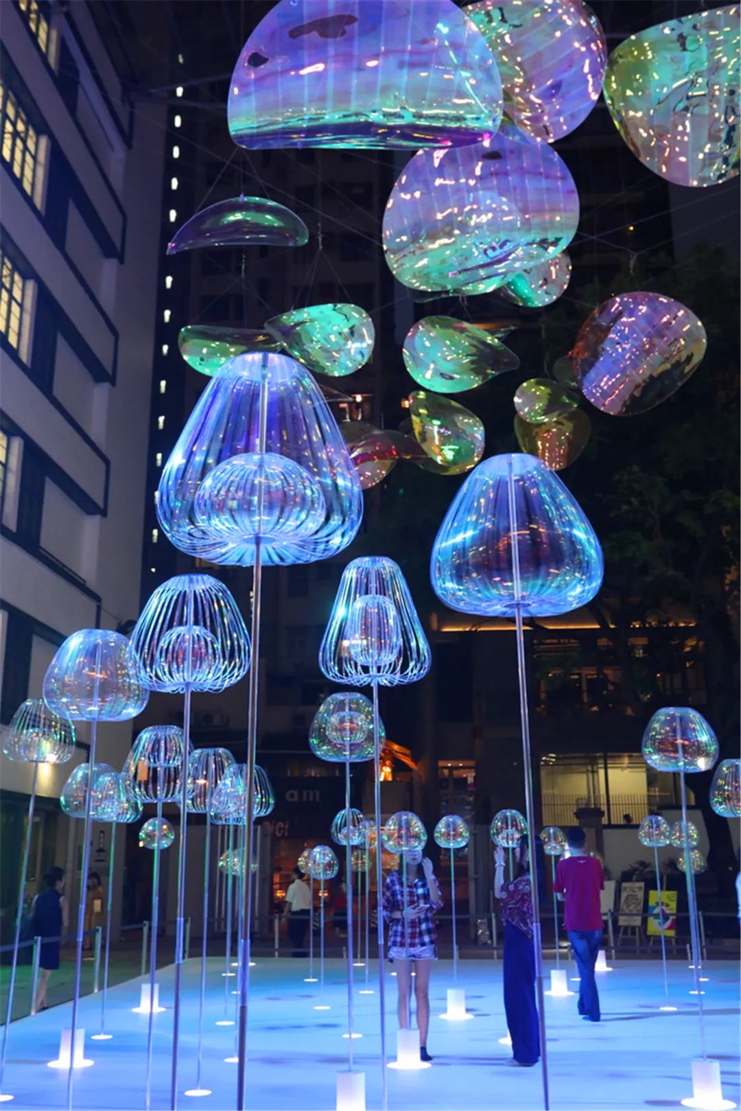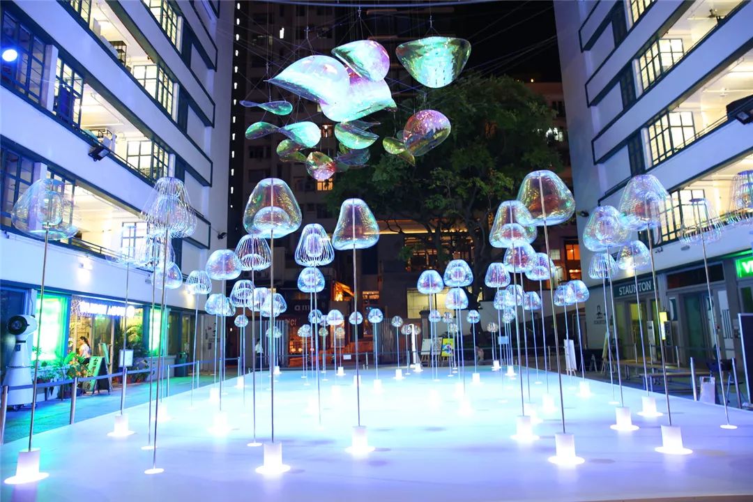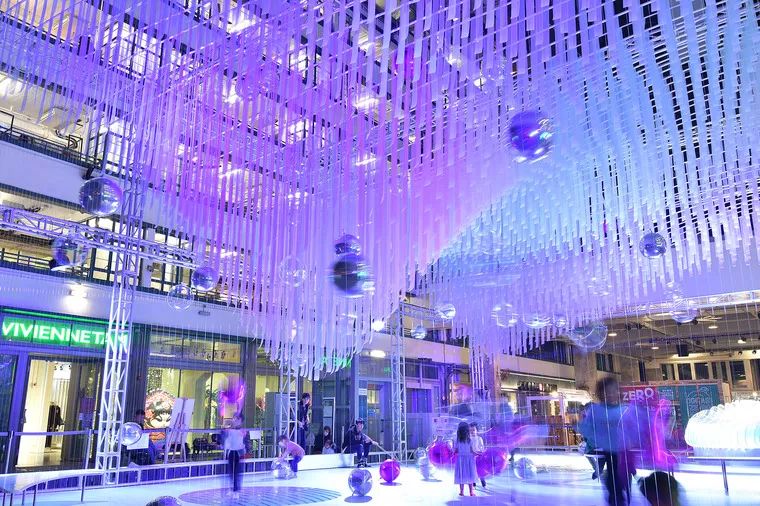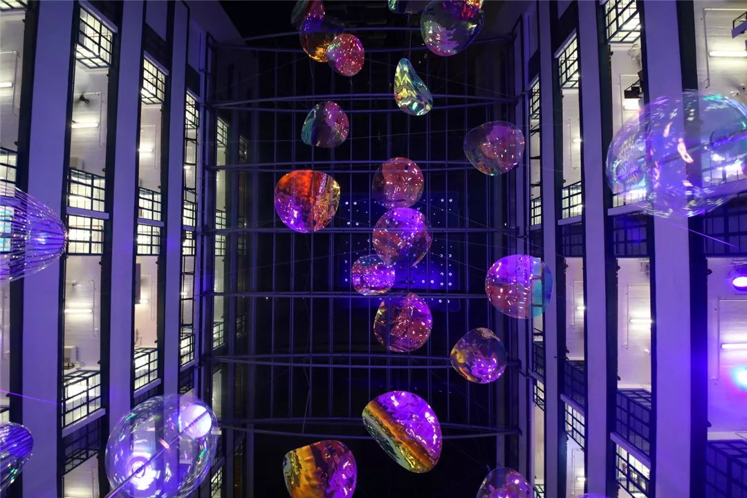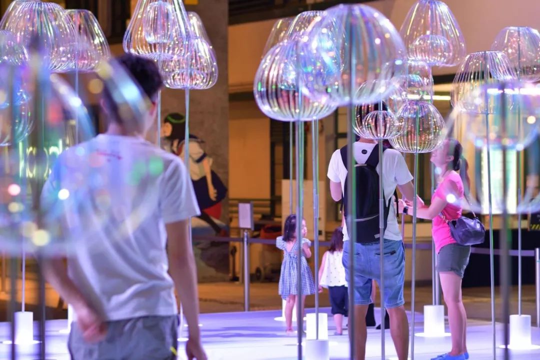 泡夏泡夏互動(dòng)裝置,變成了泡泡樂園,視覺上帶來(lái)賞心悅目的輕盈之感。?云朵飄游在上空,地上放置逾60個(gè)泡泡裝置,泡泡裝置會(huì)躍動(dòng)旋舞;人們伸手轉(zhuǎn)動(dòng)棒子,泡泡便會(huì)緩緩綻放,變出如夢(mèng)如幻的肥皂泡視覺。夜燈與泡泡相互交織,映射出神秘的光影。