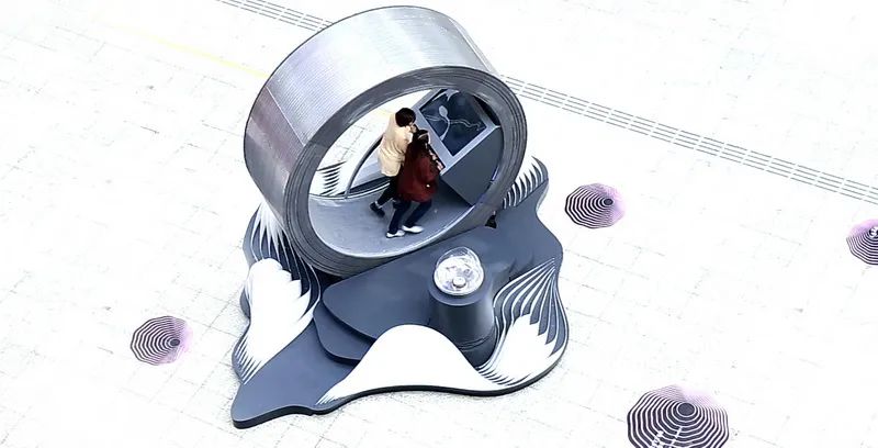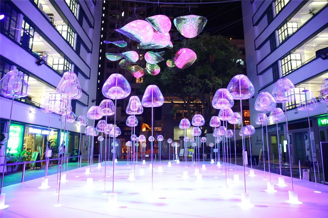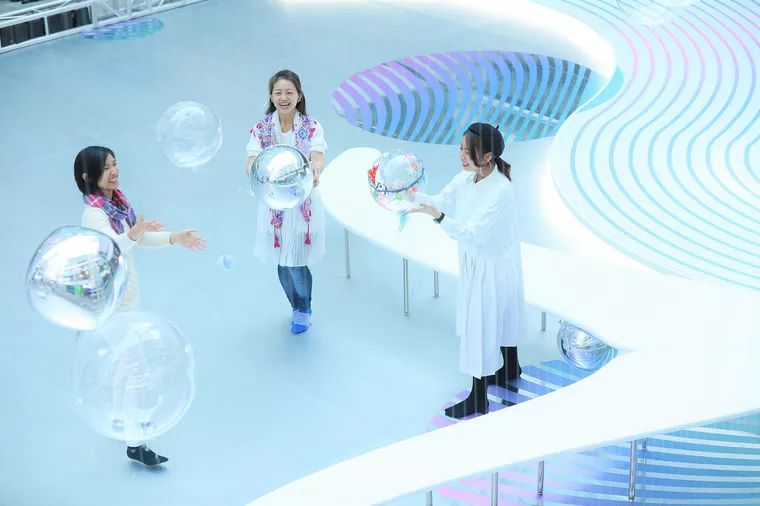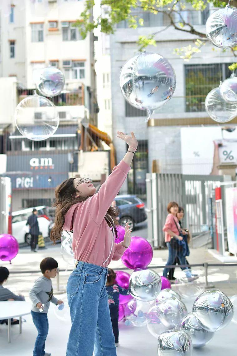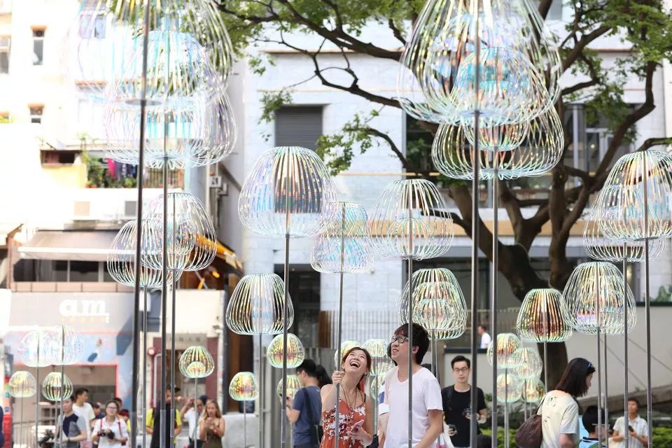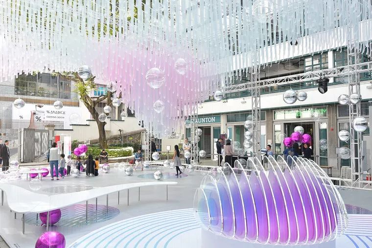 泡夏泡夏互動(dòng)裝置,變成了泡泡樂園,視覺上帶來(lái)賞心悅目的輕盈之感。?云朵飄游在上空,地上放置逾60個(gè)泡泡裝置,泡泡裝置會(huì)躍動(dòng)旋舞;人們伸手轉(zhuǎn)動(dòng)棒子,泡泡便會(huì)緩緩綻放,變出如夢(mèng)如幻的肥皂泡視覺。夜燈與泡泡相互交織,映射出神秘的光影。