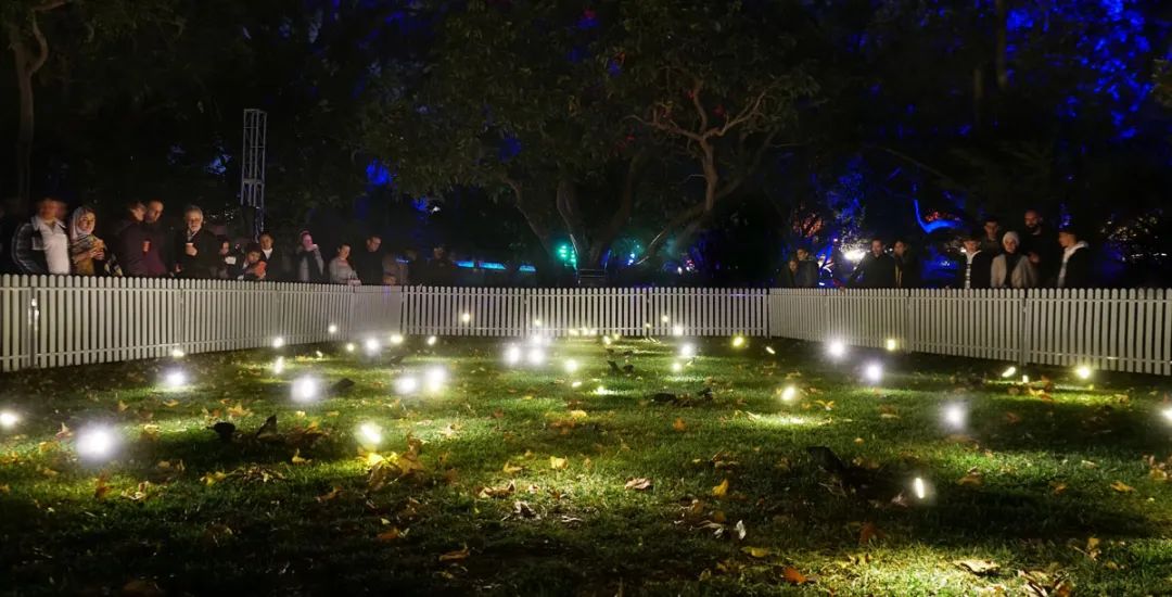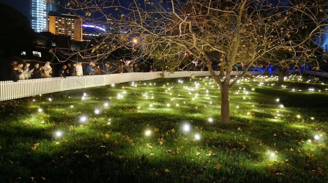 這是一個(gè)由500個(gè)運(yùn)動(dòng)光點(diǎn)組成的迷人燈光裝置,模擬螢火蟲夜間飛行軌跡,每一種閃爍模式都是一種光學(xué)信號(hào)。無(wú)數(shù)柔軟的LED棒隨風(fēng)舞動(dòng),螢火飛舞將瞬間化為永恒,體驗(yàn)反射和折射與自然的融合。LED燈封裝在透明的膠囊中,并放置在超細(xì)的鐵絲上,鐵絲隨風(fēng)搖擺,每個(gè)螢火蟲都自然運(yùn)動(dòng)。