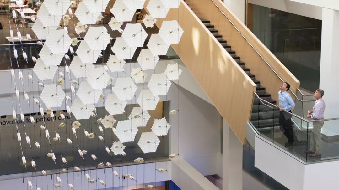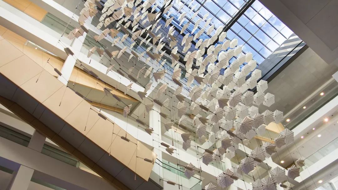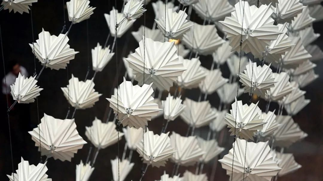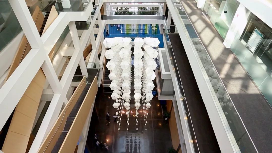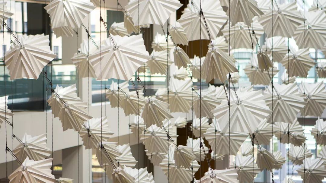 這件由Sosolimited工作室所創(chuàng)作的名為Diffusion Choir的折紙動(dòng)力雕塑,使用400個(gè)可折疊傘形元素,來(lái)表現(xiàn)一群看不見的飛鳥或魚群的運(yùn)動(dòng)。作品優(yōu)美的動(dòng)作創(chuàng)造了一個(gè)開放、靜謐、供行人享受沉思的空間。裝置的背后,是一個(gè)基于鳥群飛行的算法,其出現(xiàn)及消失的方式都顯得極其自然。鳥群最酷的一點(diǎn)是你根本無(wú)法預(yù)料它的演變,它永遠(yuǎn)在改變自己的行為模式,因此設(shè)計(jì)的時(shí)候并不想完全地控制每個(gè)小細(xì)節(jié)。每個(gè)小時(shí)它都會(huì)重復(fù)一系列的動(dòng)作,所以某種程度上它也像是個(gè)鐘。每個(gè)小時(shí)初始,這些折紙鳥們會(huì)聚集在一起,然后再逐漸分散成小群體,它其實(shí)是長(zhǎng)達(dá)一小時(shí)的循環(huán)設(shè)置。