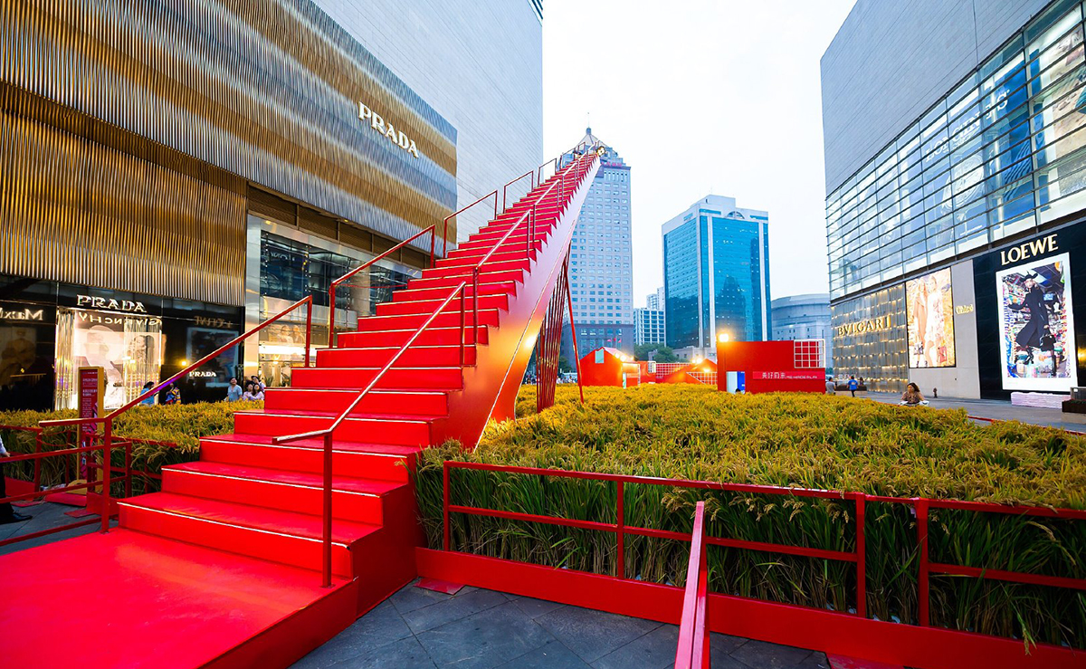 這是德基廣場(chǎng)攜手現(xiàn)代快報(bào)推出的《風(fēng)吹稻浪 紅望金收 獻(xiàn)禮70年新中國(guó)》主題展?,F(xiàn)場(chǎng),800平方米的金色稻田,壯觀又美麗。稻田的盡頭還佇立著一棵石榴樹,紅彤彤的石榴垂?jié)M枝頭,點(diǎn)綴了整個(gè)稻田。稻田前方還有一座9米高的紅色天梯,順著臺(tái)階上去,稻田風(fēng)景盡收眼底。幾條小道直通稻田中央,還有6間紅色小房子錯(cuò)落有致地散布在稻田四周。