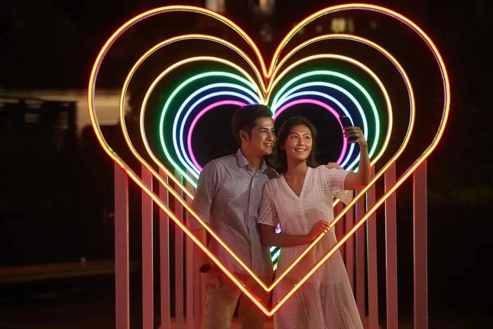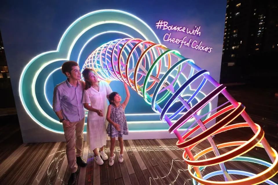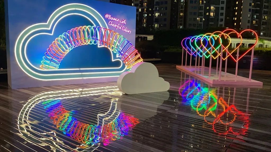 一圈圈的七彩彈弓仿佛幻化成飛云駕霧的天梯,踏上云端后會(huì)否Fly Me To TheMoon,讓大家近距離看見(jiàn)高掛的明月?快拉著同伴的手進(jìn)入這「夢(mèng)幻云霧彩虹相框」,在云與七彩彈弓之間游走嬉戲,享受月光滿瀉的幸福好時(shí)光。旁邊用霓虹燈造成的字句,亦與打卡位互相呼應(yīng),讓人看過(guò)后會(huì)心微笑!