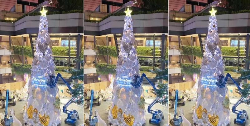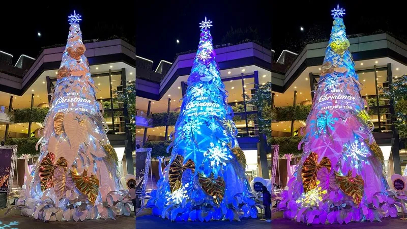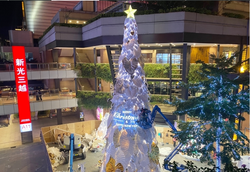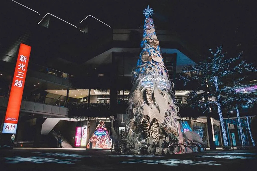 因應(yīng)地球日50周年,新光三越今年以「永續(xù)的共生」為概念,17米高的雪白圣誕樹造型與往年不同,以純白熱帶植物葉子裝飾,既高雅又夢(mèng)幻,號(hào)稱是「全臺(tái)最美的耶誕樹」,簡約白色點(diǎn)綴金銀色,是純凈、共榮的象征,運(yùn)用五萬個(gè)寶特瓶及玻璃瓶(1.5噸)再生原料混合椰子纖維,制作成五千片栩栩如生的葉片,以人工堆疊的方式,聚集成純白色的希望之樹。其中六成以上僅使用剪裁及真空方式制成,無添加余漆劑染料,拆除后可完全回收,大幅減少活動(dòng)后產(chǎn)生的廢棄物量。