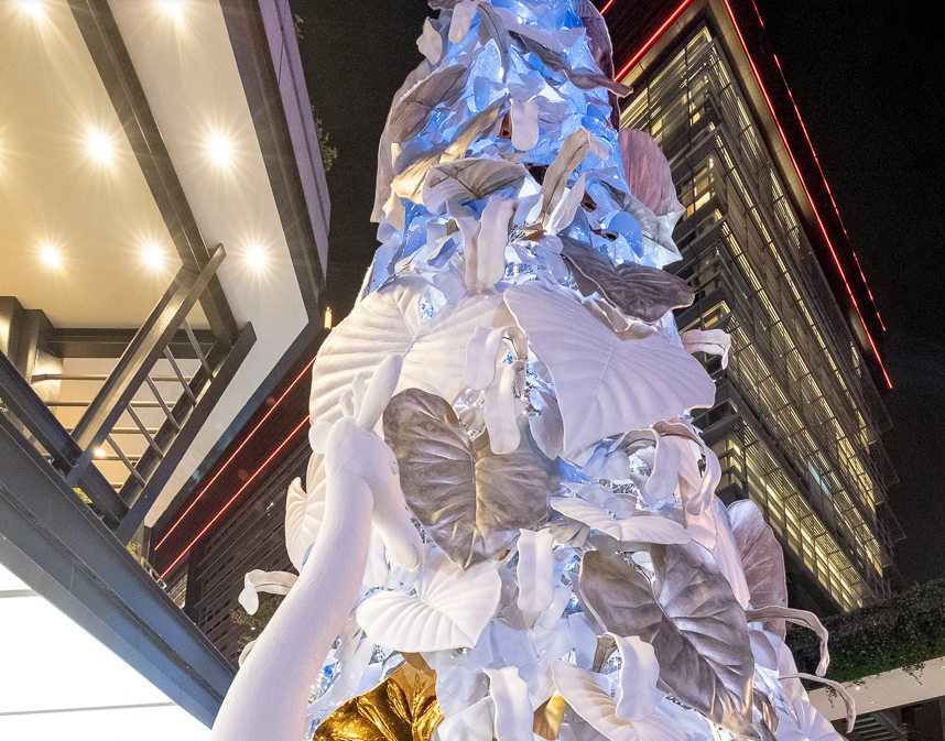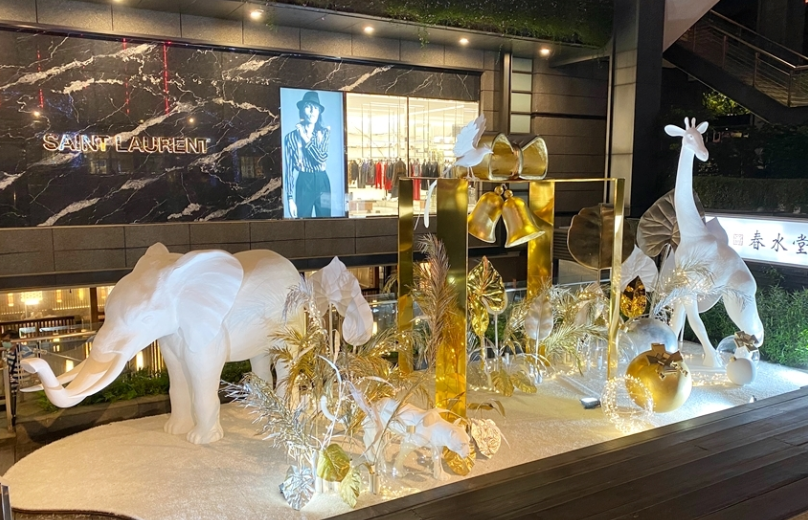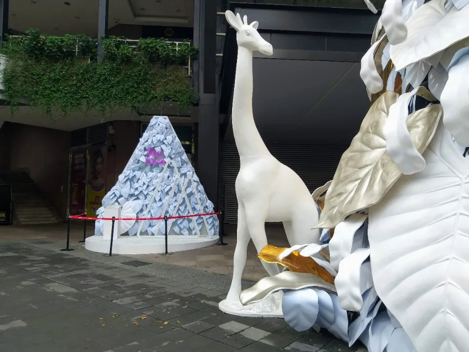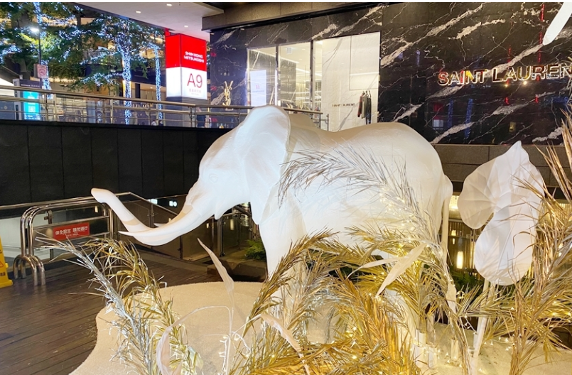 北歐風(fēng)格的白色耶誕樹為主角、并點(diǎn)綴金色葉子,周圍還有大象、長頸鹿等動(dòng)物環(huán)繞著,如同來到浪漫的森林中。純白長頸鹿、大象,運(yùn)用再生材質(zhì)結(jié)合椰子纖維作為模型的表面材,刻意不做其他再加工的涂裝漆料,自然呈現(xiàn)纖維絲及粗糙質(zhì)地,不僅減輕了以往制作的雕塑品的碳排放一半以上,運(yùn)用的材質(zhì)于結(jié)束后,也能自然分解。