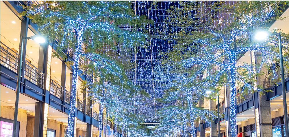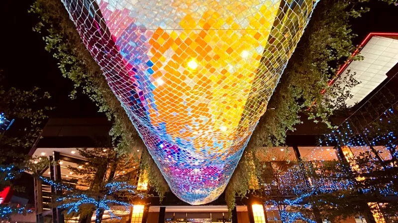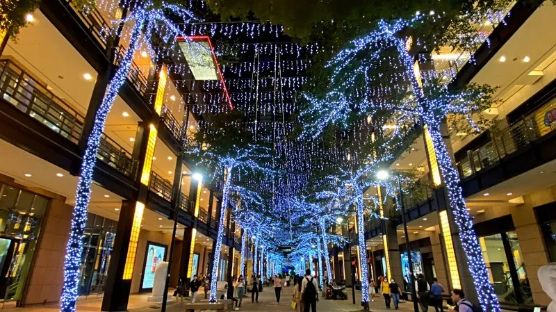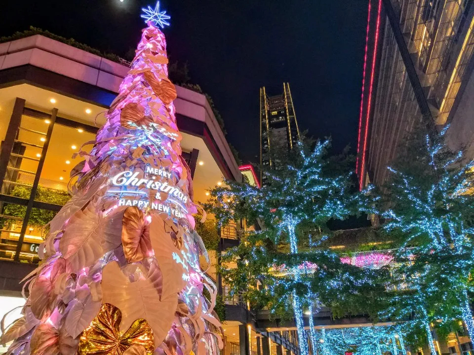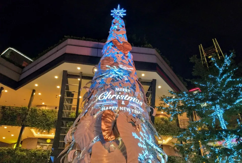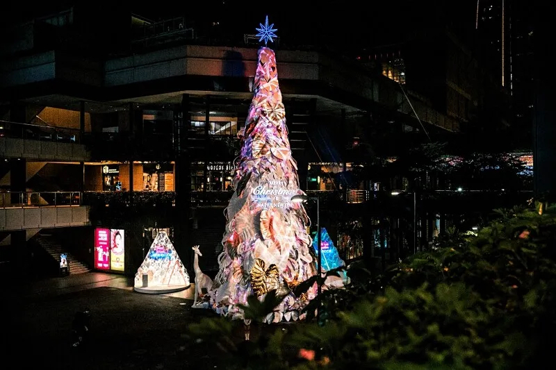 到了晚上整點(diǎn)時(shí),還會(huì)有圣誕樹光雕秀登場(chǎng),伴隨著光影變幻,原本純白色的巨大圣誕樹,不斷地?fù)Q上不用的色彩;在此同時(shí)還會(huì)從圣誕樹的后側(cè)灑下雪花。