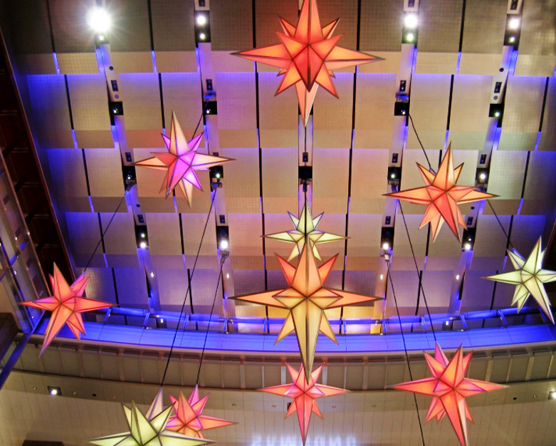 The Shops at Columbus Circle舉辦的Holiday Under the Stars大型燈光秀上,用了共有12顆14英尺高的特殊星星燈懸掛在150英尺高的室內(nèi)天花板上。這個是鋼結(jié)構(gòu)+內(nèi)置燈光組成,還會不斷的變換色彩。星星燈看上去很壯觀美麗,訪客可以在逛街之余,抬頭看看這些會閃亮變色的星星!