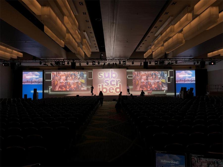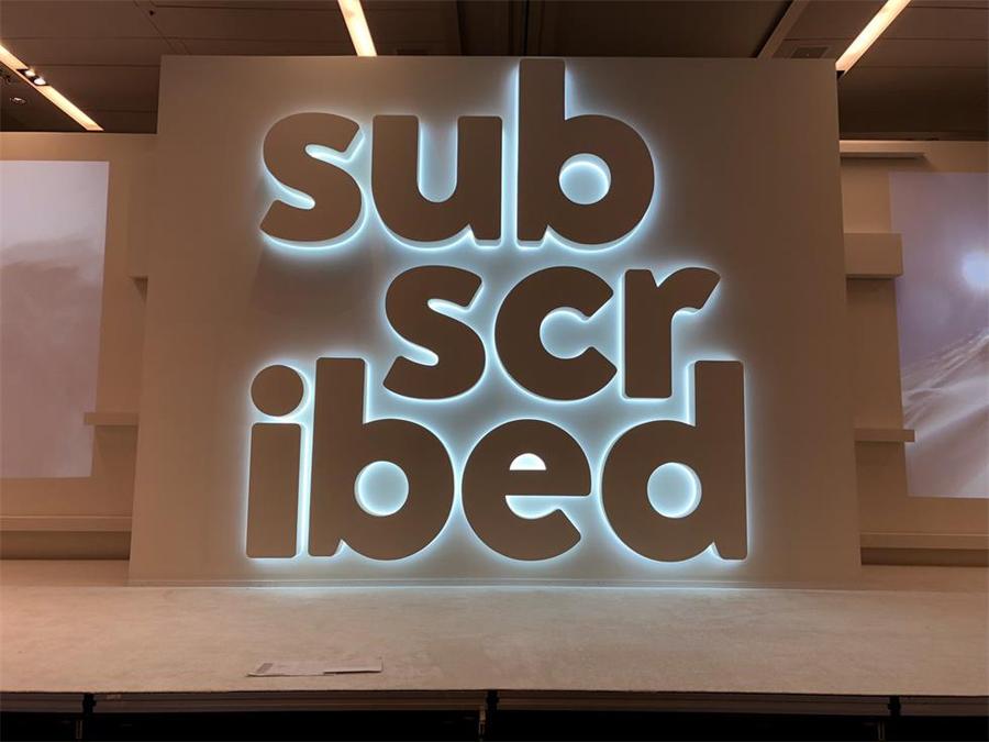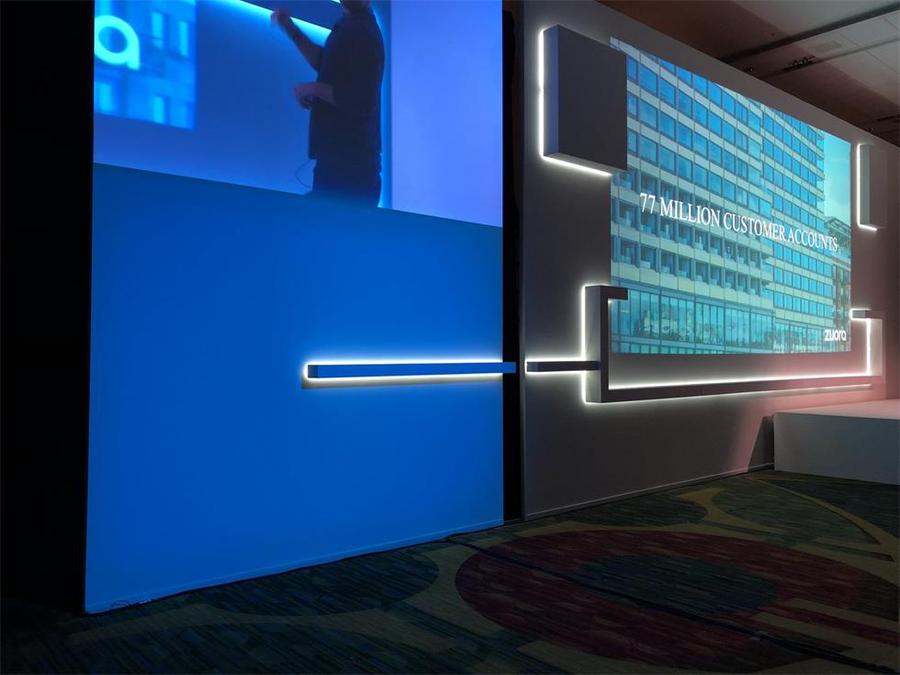 從沉浸式的設(shè)計思路開始,舞臺背景110’寬x 18’高,它由5個部分組成:4個投影面和一個大的中心視覺墻。墻壁被無縫地包裹在白色細布中,然后應(yīng)用定制的背光光暈照明裝置。舞臺布景的焦點是公司的三維訂閱標志,這是用數(shù)控泡沫雕刻機制作的。巨大的字母和舞臺裝飾有4 – 8”厚,由EPS泡沫和泡沫PVC啞光材料構(gòu)成,沉浸式的投影映射讓舞臺呈現(xiàn)出動態(tài)感?;顒蝇F(xiàn)場使用了超過137米長的LED燈帶來呈現(xiàn)背光效果,而發(fā)光表面的組合給整個舞臺效果帶來了一個有趣的維度,這在全白的舞臺設(shè)計是不常見的。
