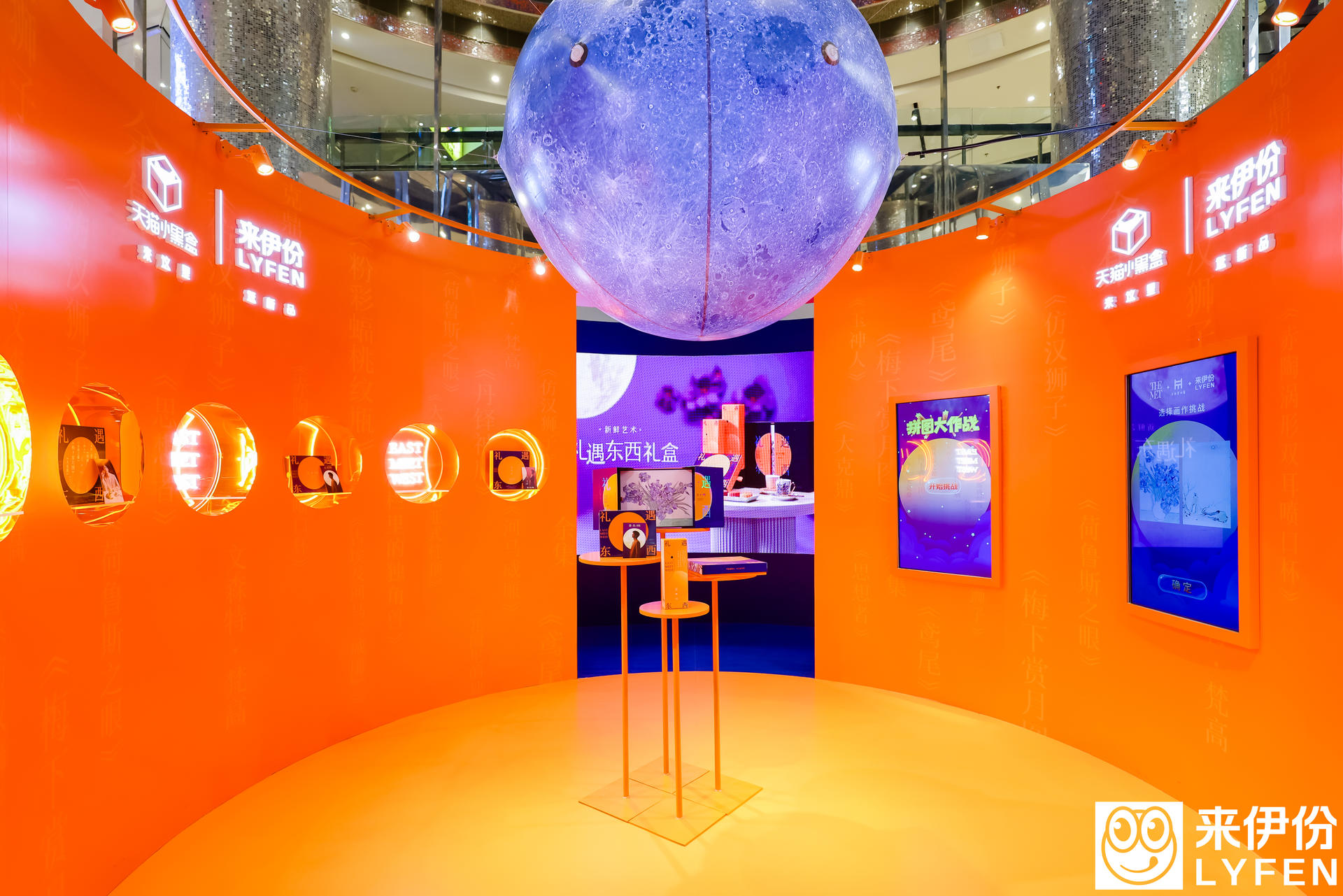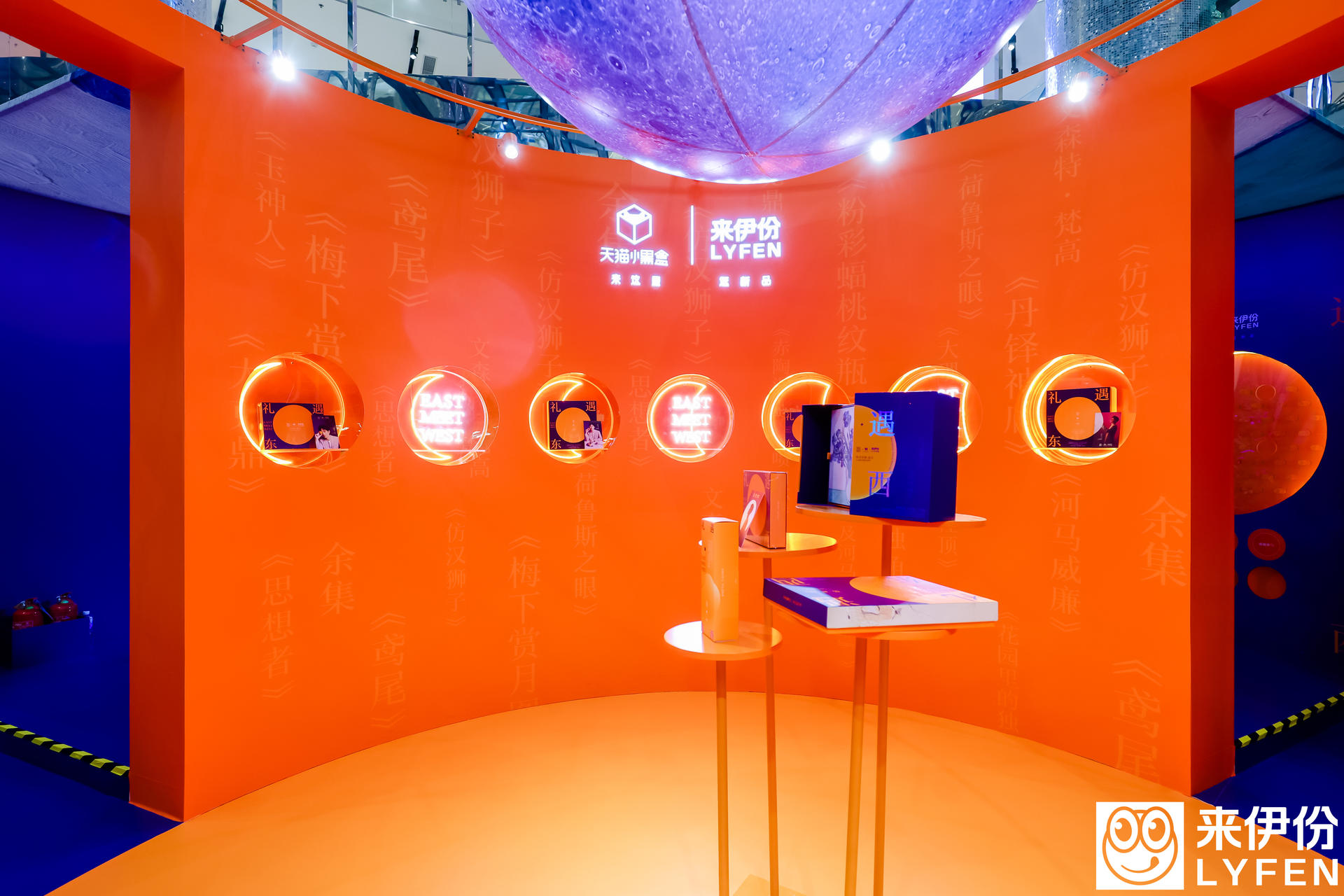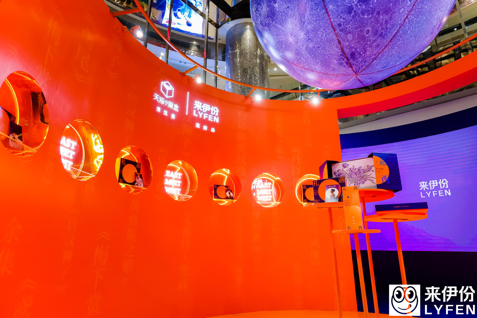 本次的來(lái)伊份“禮遇東西”中秋限時(shí)快閃店坐落于上海靜安大悅城南座,以深邃的星河藍(lán)筑起一座小型博物館,集鮮潮美食、博物館藏與一體,打造出沉浸感“視、聽(tīng)、玩、樂(lè)”多維度感官盛宴,在工作日便吸引不少顧客前來(lái)參觀打卡。
