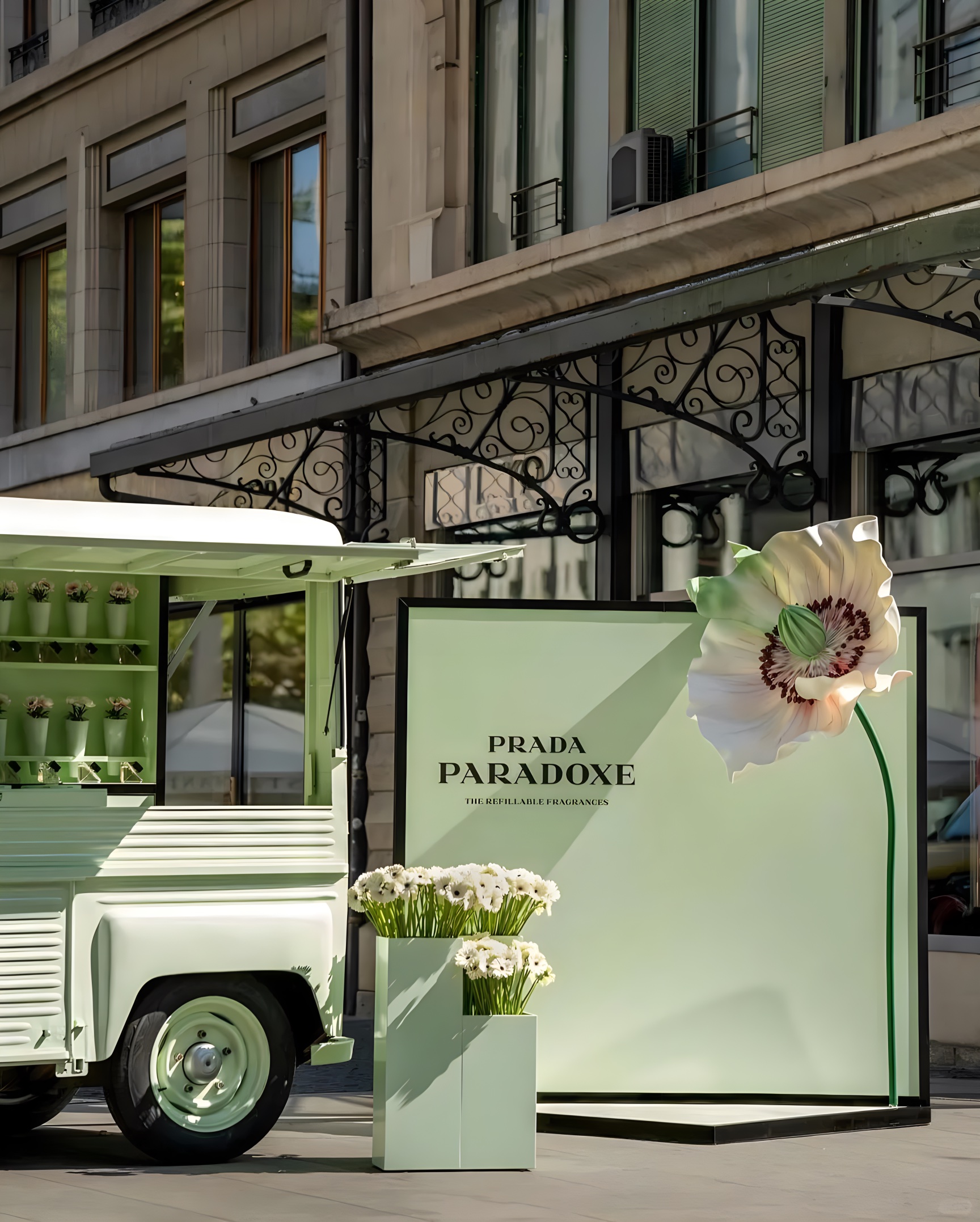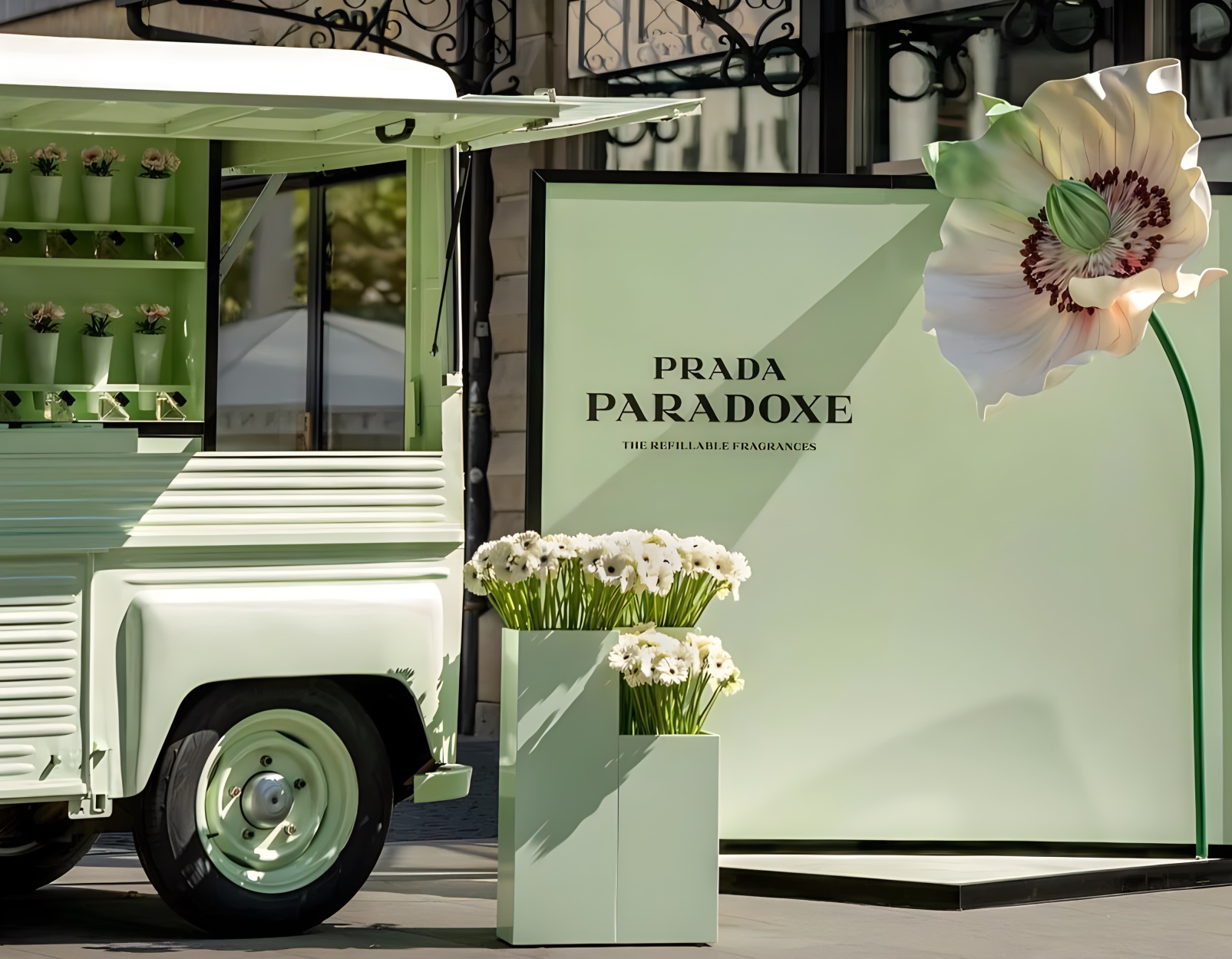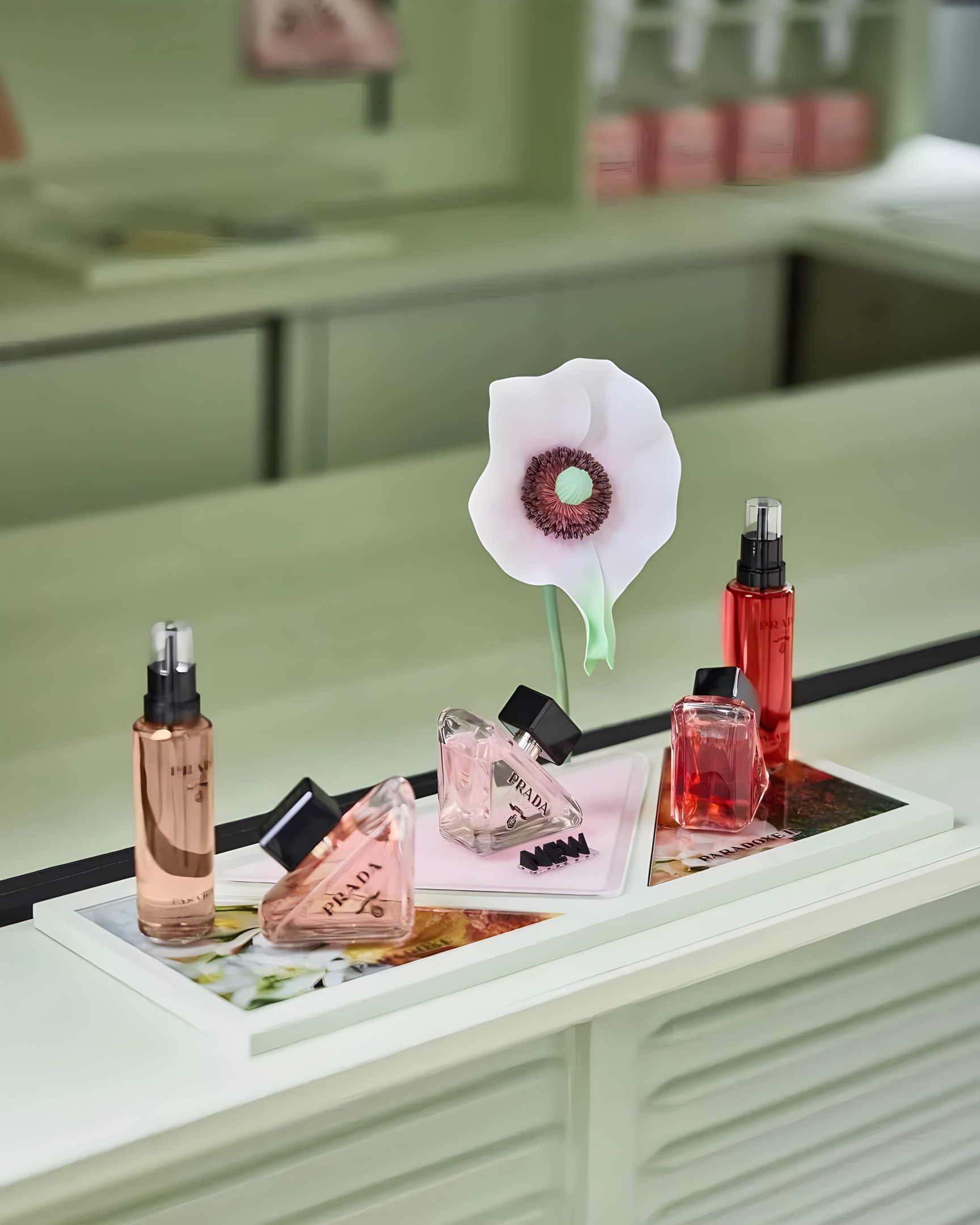 為了推廣 Paradoxe Virtual Flower 香水,普拉達精心設計了備受矚目的時刻,注重細節(jié)與設計,沉浸式的氣味體驗室,充滿香水氣泡,精心策劃的花市。