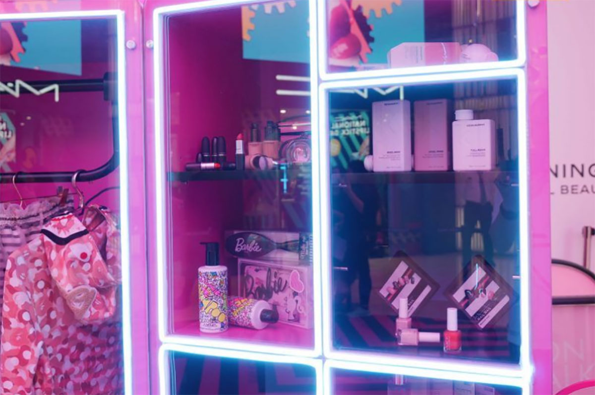 在商場(chǎng)的地下中庭,放置了一個(gè)2.5米高的衣柜,衣柜以?shī)Z目型格的螢光粉紅色拼上湖水藍(lán)色及黑色,十分搶眼。衣柜將首次展示芭比娃娃日本特別版的女裝服飾和2019年的最新鞋類系列。