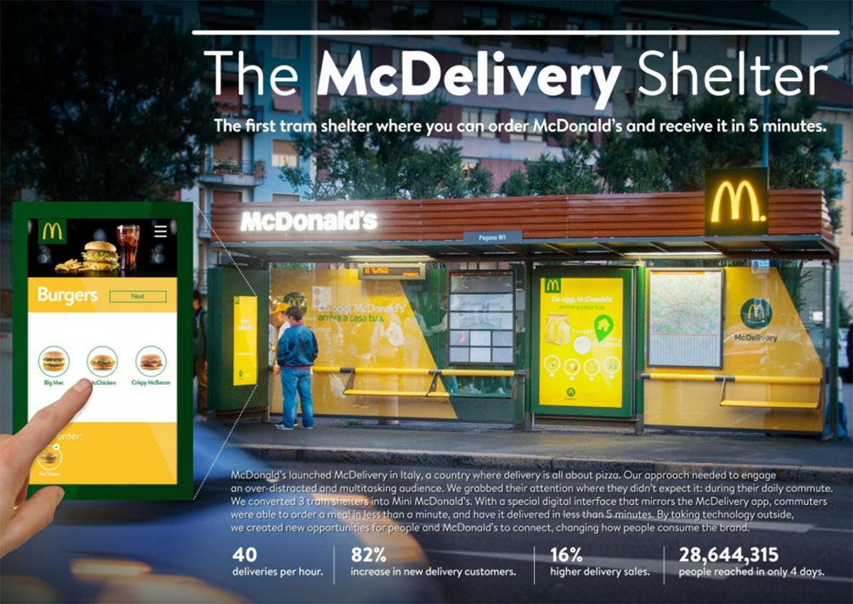 交付正在成為麥當(dāng)勞全球業(yè)務(wù)的重要組成部分。對(duì)于意大利人來說,交付都是關(guān)于比薩餅的,所以我們知道需要采用不同的方法。McDelivery Shelter是一個(gè)新的商業(yè)理念,可以與人們建立即時(shí)一對(duì)一關(guān)系,讓他們按照自己的條件實(shí)時(shí)購買食物。通過簡單直觀的界面,您可以在不到一分鐘的時(shí)間內(nèi)訂購食物,并在5分鐘內(nèi)送達(dá)。因此,意大利的McDelivery Shelter為該品牌取得了出色的業(yè)績,并未麥當(dāng)勞帶來了革新客戶體驗(yàn)的新途徑。
