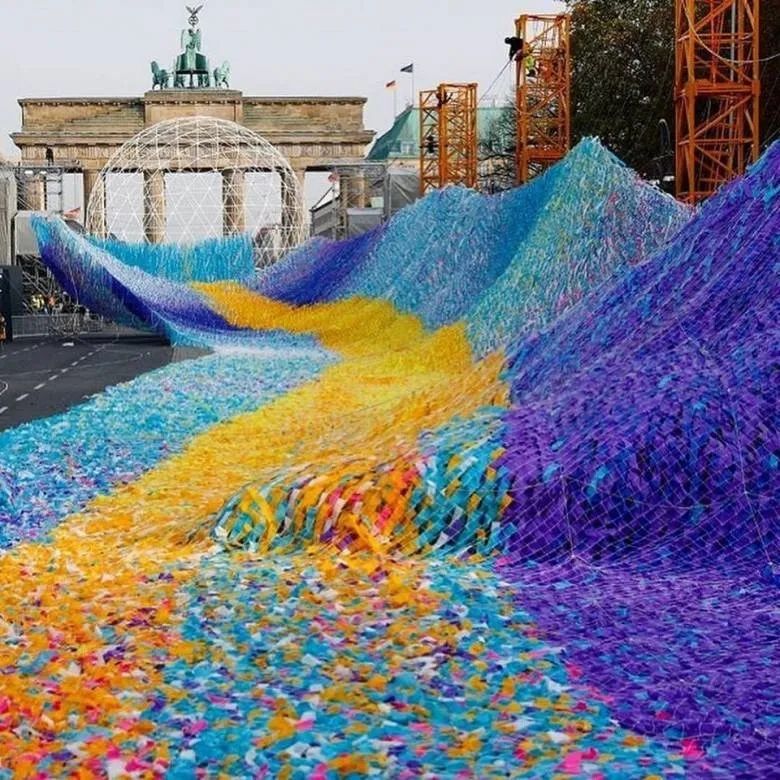 德國柏林墻倒塌30周年,為了紀念這一天,德國非營利組織“柏林文化項目”(Kulturprojekte Berlin)在柏林舉辦了一系列紀念活動,而活動焦點之一便是美國藝術(shù)家Patrick Shearn及其團隊“詩意動力學(xué)”(Poetic Kinetics)?用12萬條彩帶創(chuàng)作了大型的動力學(xué)藝術(shù)裝置作品,取名為“Visions in Motion”。