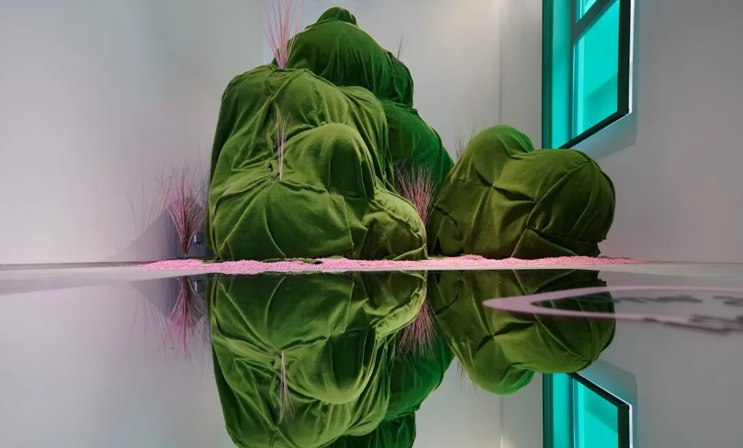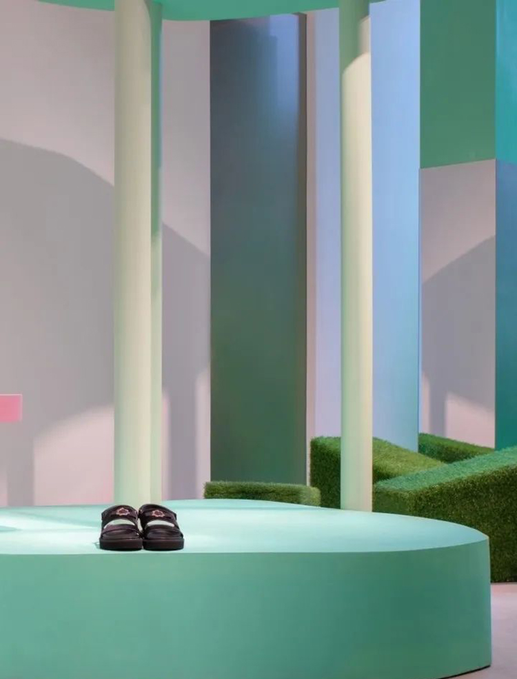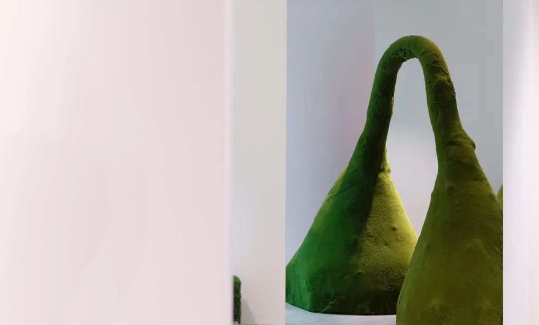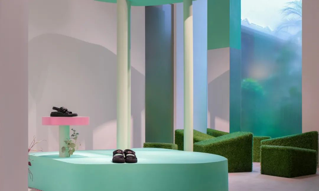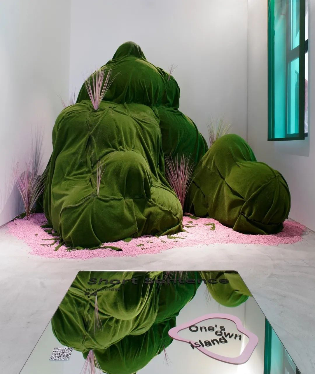 快閃店?One’s own island?這次在不同空間用不同觸感的草皮來模擬不同形態(tài)的島嶼質(zhì)地,標(biāo)志性的浪漫粉色基調(diào)被打散在各個空間中:有親手上色的粉色綠植、粉色mini石 、粉色島嶼頂層、粉色鏤空形衣架等等。快閃店的空間設(shè)計從入口處開始打造“登島”氛圍,穿過一個植被走廊就進入到空間之中,這讓觀眾的體驗感更加豐富。圍繞One’s own island的島嶼主題,空間內(nèi)還設(shè)計了一系列裝置,例如島嶼形狀的座位和植被裝置,從墻縫里生長出來的植物等細節(jié),自然與現(xiàn)代裝置的結(jié)合,完美平衡,新鮮感剛好處于讓人舒服的程度。