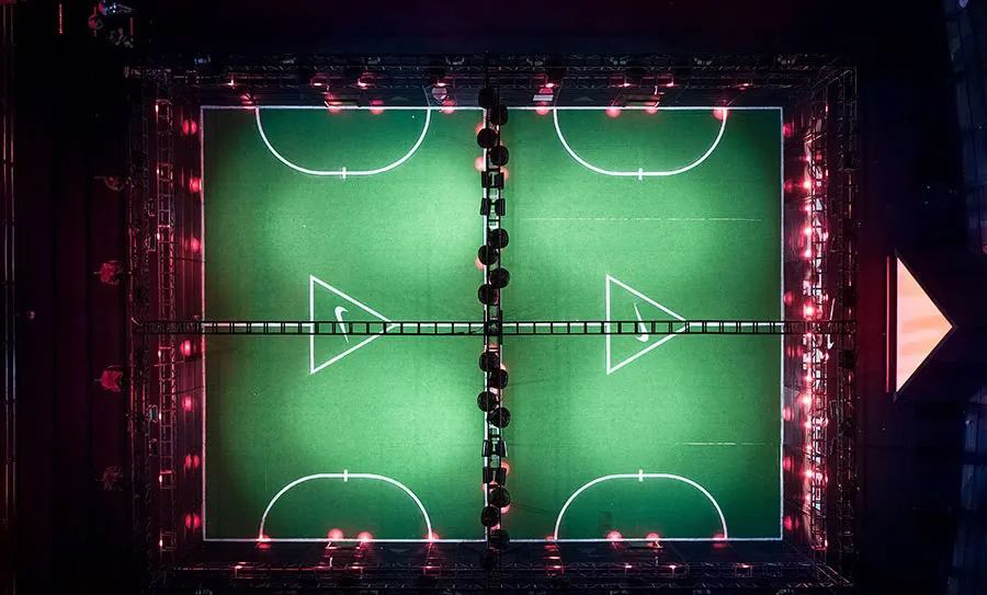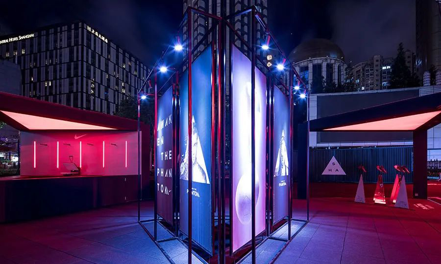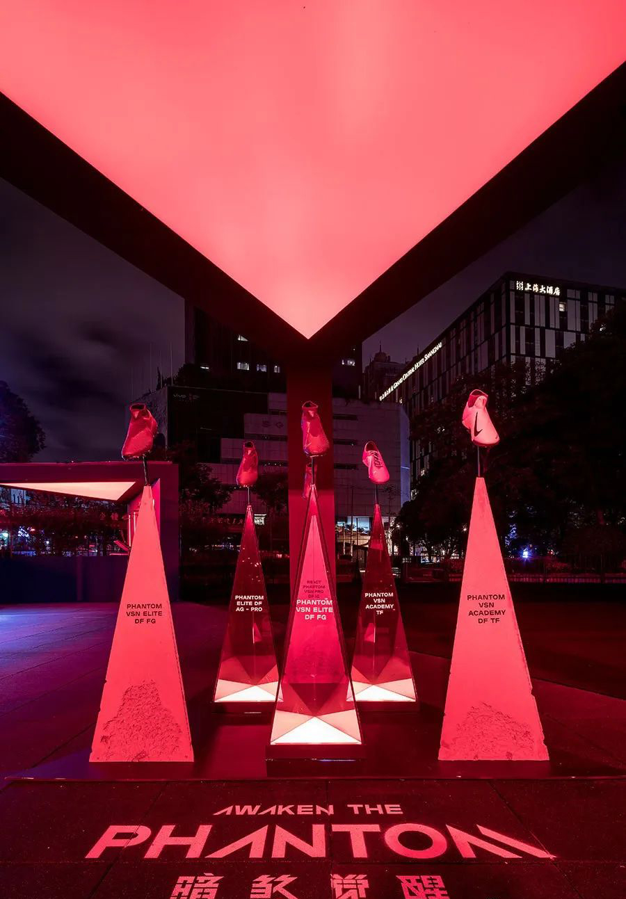NIKE耐克幻影快閃店的靈感來源于暗煞戰(zhàn)靴系列本身三角形結(jié)構(gòu),?具有極高表現(xiàn)力的足球鞋專門為支撐在控球中起到關(guān)鍵作用的三組腳骨而設(shè)計(jì)。無與倫比的穩(wěn)定性結(jié)構(gòu),預(yù)示性的速度,攻擊力,當(dāng)然還有足球中策略性的帶球過人,戰(zhàn)靴不論從其形態(tài)到功能都暗示著“暗煞”這一系列的本色。