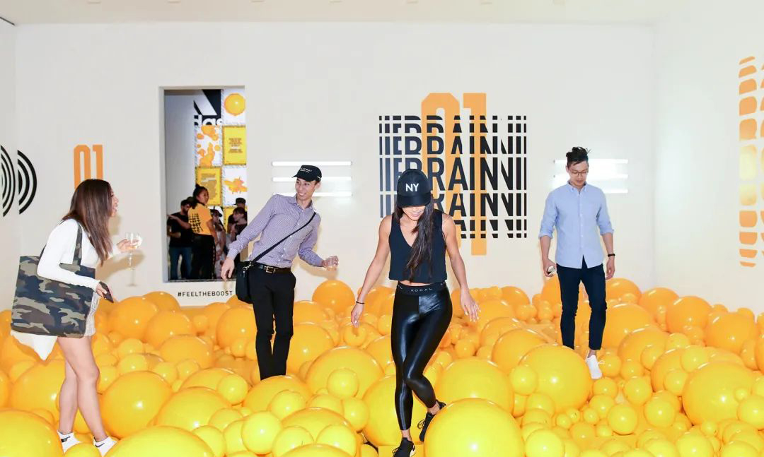 互動游樂場的主色調(diào)為蛋黃色,由增強想象力(BOOST your brain)、創(chuàng)造(BOOST your creativity)、未來(BOOST your future)三個區(qū)域組成。每個區(qū)域都提供了不同的活動,幫助消費者從各個角度測試跑鞋的性能。
