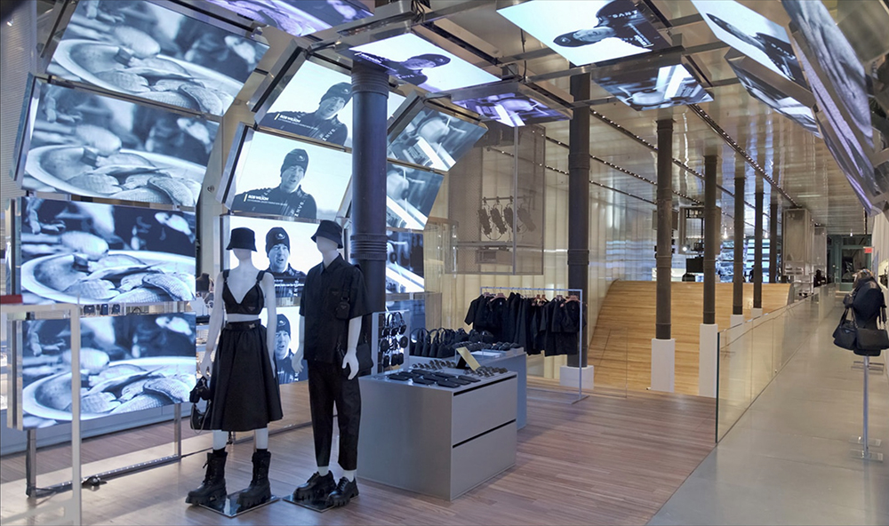 為展示2020再生尼龍系列,Prada與全球知名商場(chǎng)合作推出快閃店,同時(shí)亦在Prada精品店打造特別呈現(xiàn),限時(shí)呈現(xiàn)“再生尼龍”沉浸體驗(yàn)。店內(nèi)布景式大拱頂及墻面均同步播放Prada宣傳合作伙伴《國(guó)家地理》制作的系列短片,展現(xiàn)再生尼龍回收及生產(chǎn)技術(shù)。