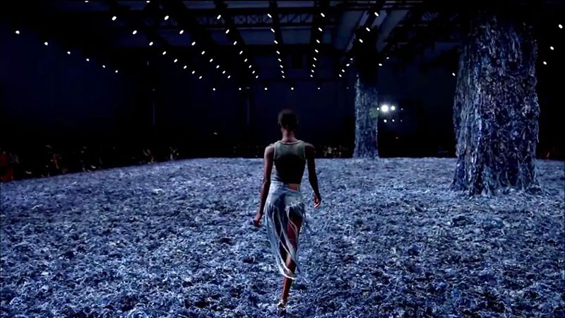Diesel2025春夏系列時裝秀,以再生面料為靈感,借以宣揚時裝的可持續(xù)性,使用了14,800公斤牛仔布廢料打造了一個極具視覺沖擊力的沉浸式秀場。不僅僅模特身穿的服飾是由回收印花絲巾、紗線等材料制作而成,現(xiàn)場這14800公斤牛仔廢料也都會在秀后重新回收利用制作服飾,藝術(shù)時尚與環(huán)??沙掷m(xù)完美結(jié)合。滿地的牛仔廢料,感官刺激的同時也是對末日一種藝術(shù)化表達,當(dāng)然更是對模特臺步功底的考驗。