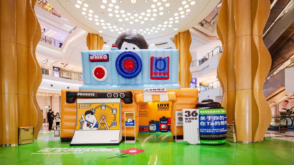將近6米高的巨大WHIKO手持大型相機(jī)出現(xiàn)在靜安大悅城,人類穿過相機(jī)便進(jìn)入了WHIKO的「浪漫研究所」當(dāng)中。展覽的主展區(qū)由四個(gè)部分組成,分別展示W(wǎng)HIKO對浪漫的不同定義,每一個(gè)主題區(qū)域都通過插畫故事繪本的形式展示了WHIKO見證浪漫的點(diǎn)點(diǎn)滴滴。